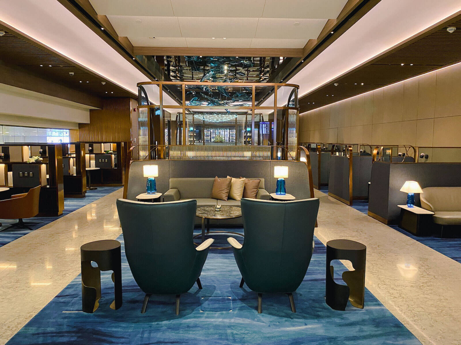 Unterstützt wurde Singapore Airlines beim neuen Design ihrer Lounges von dem amerikanischen Unternehmen Hirsch Bedner Associates. Der Fokus bei dem neuen Design liegt auf Eleganz, um den Gästen eine entspannte Atmosphäre zu bieten. Leider bietet der neue Private Room kein natürliches Licht und mit dem neuen Design, welches überwiegend in dunklen Farben gehalten ist, wirkt der gesamte Private Room vielleicht ein bisschen düster. In der Lobby des Private Room hängt eine große Deckenlampe, die einem direkt ins Auge fällt und der Lounge einen ersten imposanten Eindruck verleiht. Wenn ihr in der Lobby steht, seht ihr bereits die diversen Sitzmöglichkeiten die der Private Room zu bieten hat.