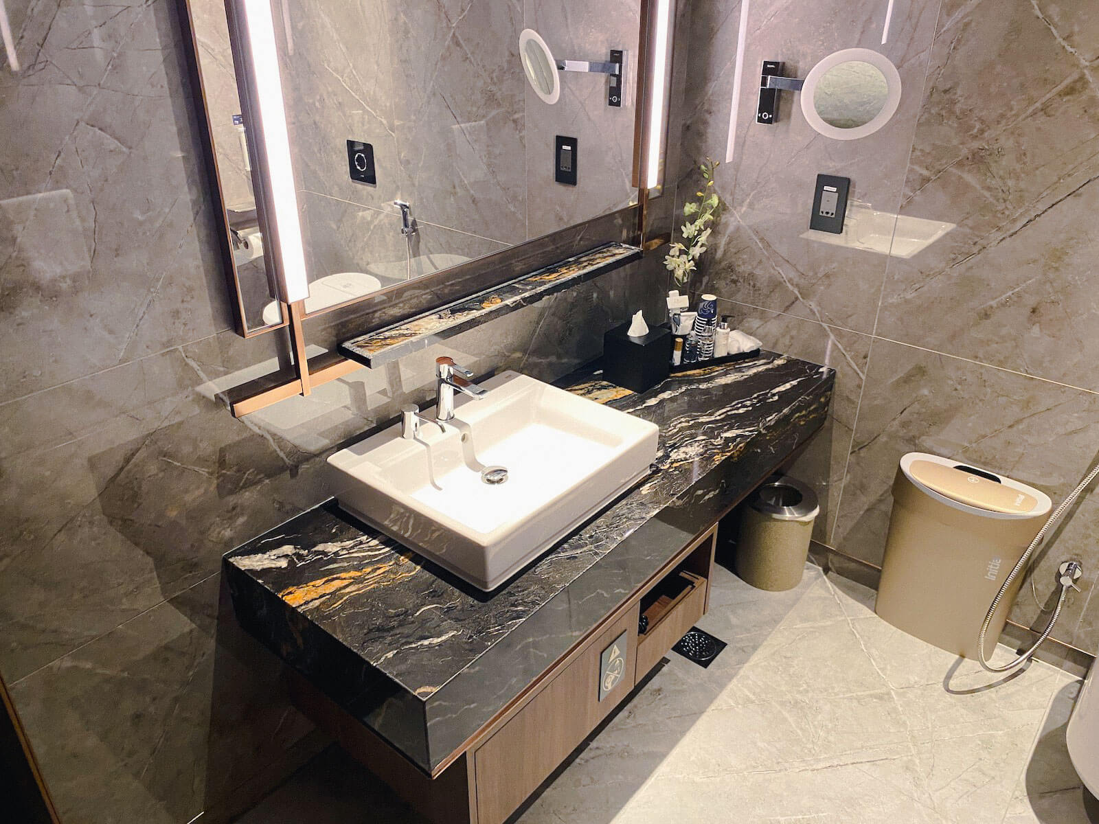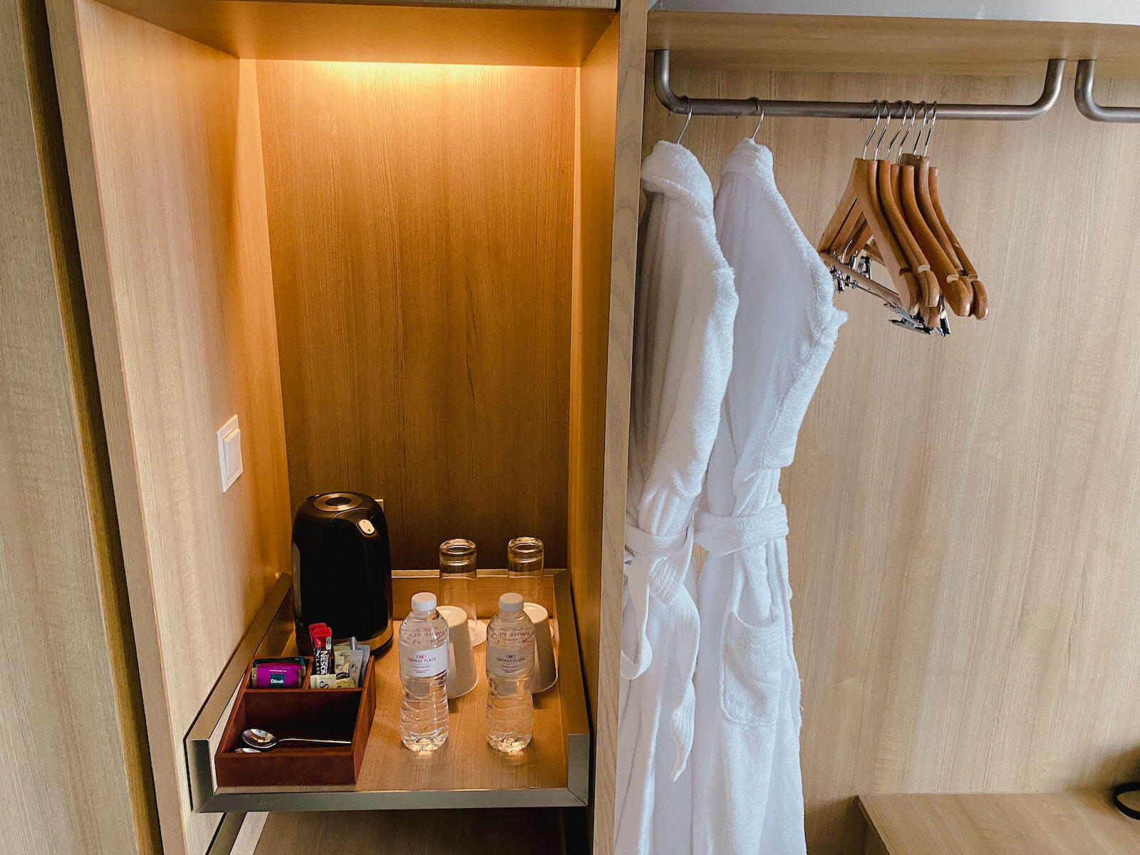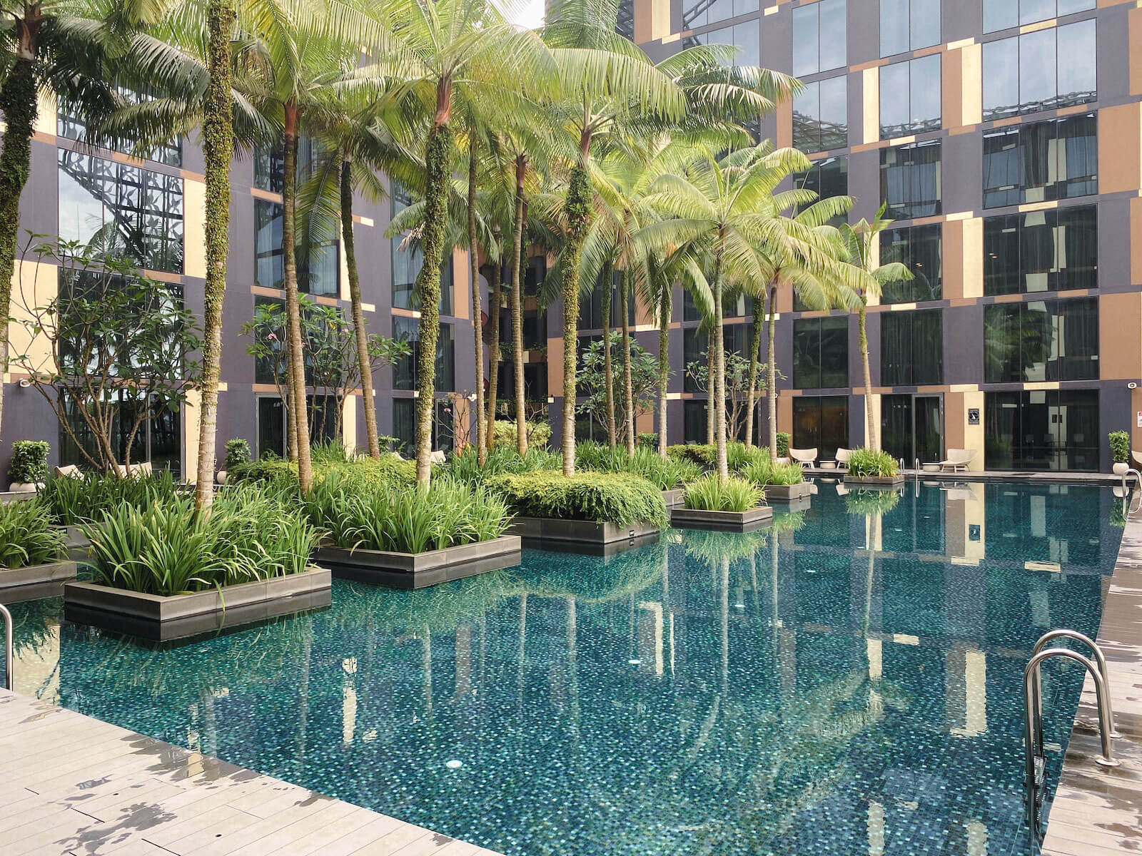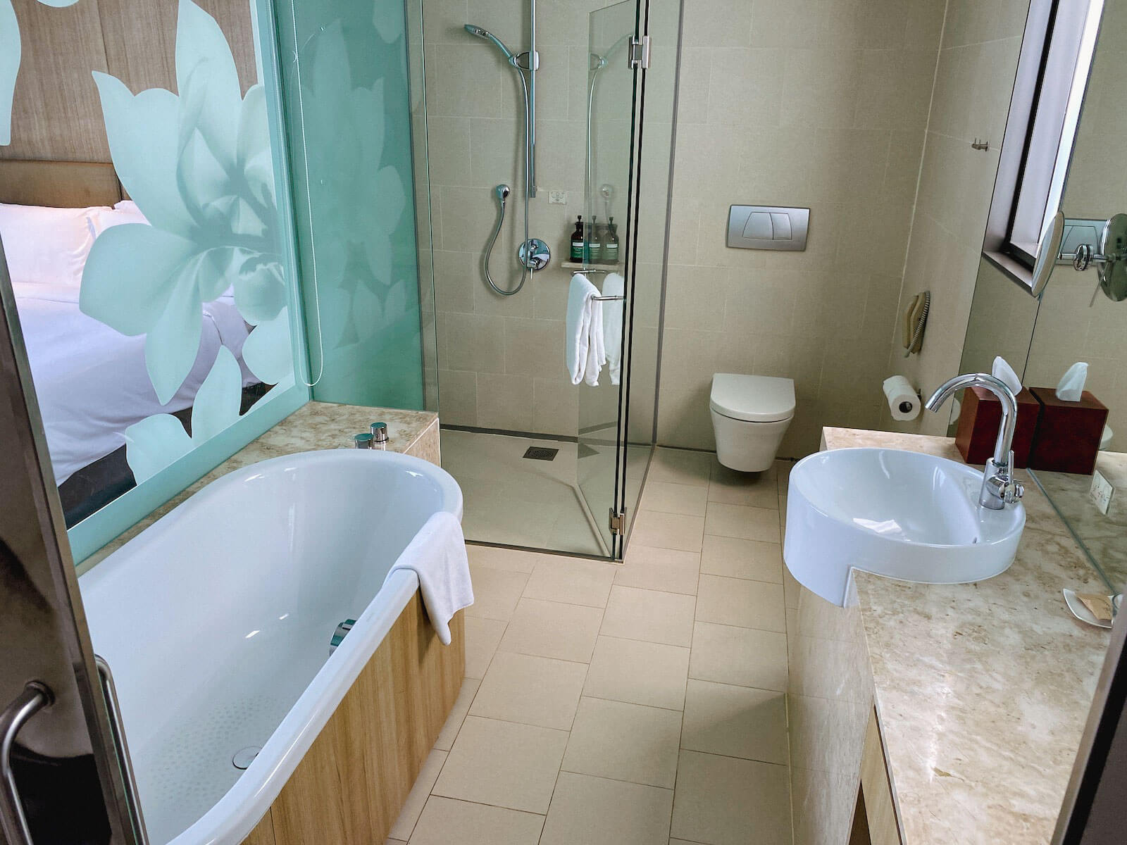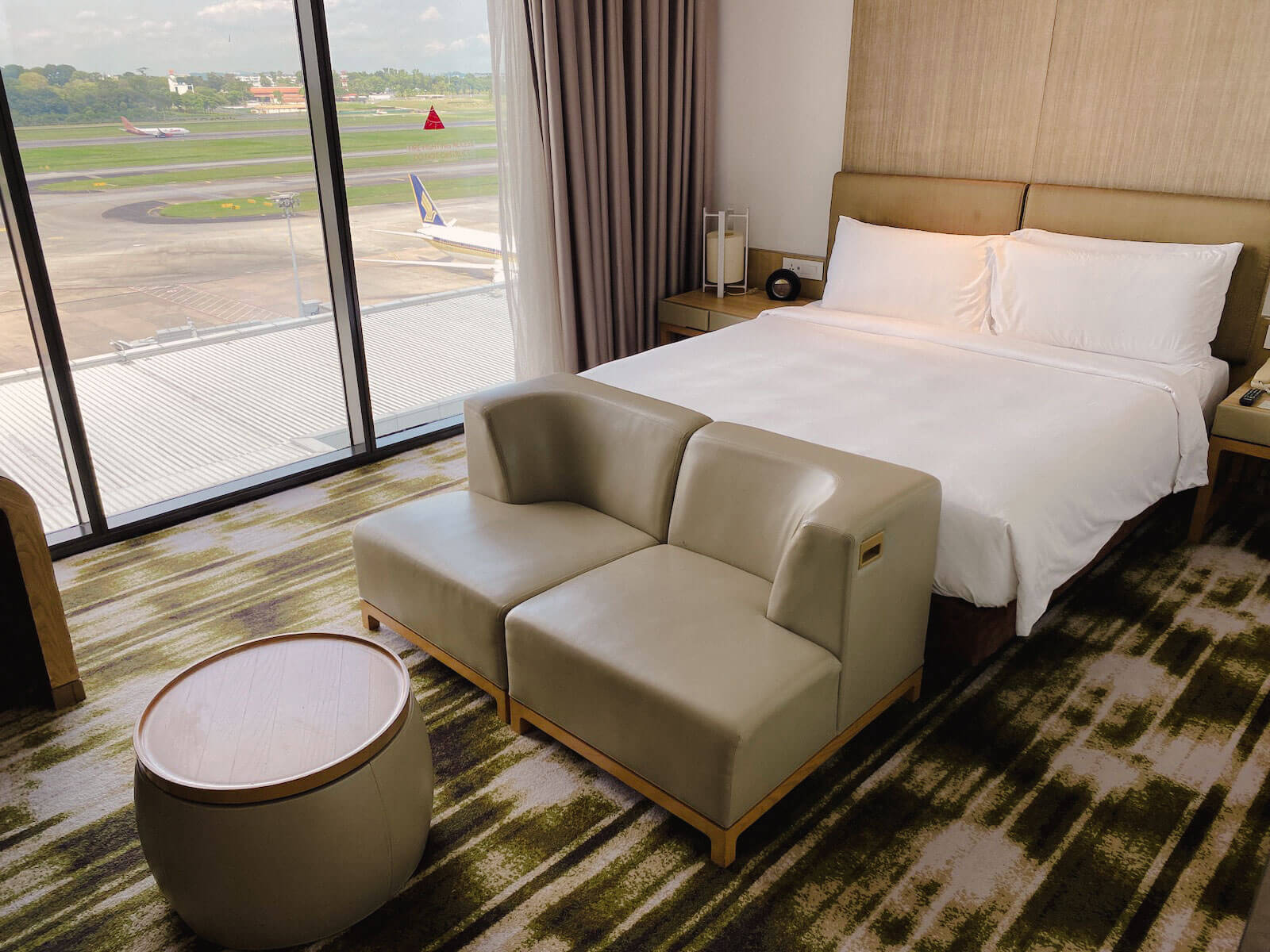Der Abflug für unseren Flug von Singapur nach London sollte am frühen Morgen um 09:00 Uhr sein. Wir wollten den Tag entspannt angehen und auf möglichst kurzem Wege in den Private Room kommen, um das gesamte First Class Erlebnis ausgiebig zu genießen. Somit entschieden wir uns für eine Nacht im Crowne Plaza Changi Airport, welches direkt mit dem Terminal 3 verbunden ist. Wenn ihr lediglich eine Nacht in Singapur verbringt und nicht in die Stadt fahren möchtet, dann ist das Crown Plaza Changi eine echte Empfehlung. Es hat direkten Zugang zum Terminal und “The Jewel” ist ebenfalls schnell zu erreichen. Ich hatte ein Standard Runway View Zimmer mit Blick auf die Start- und Landebahn gebucht, um noch das ein oder andere Foto zu machen. Das Zimmer war groß, bot genügend Platz und war sauber. An einigen Stellen im Zimmer war ein gewisses Alter zu erkennen. Das eine oder andere Möbelstück hatte schon einige Schrammen abbekommen. Ansonsten bietet das Hotel einen Poolbereich, ein großes Fitnessstudio, eine Bar und ein Restaurant.