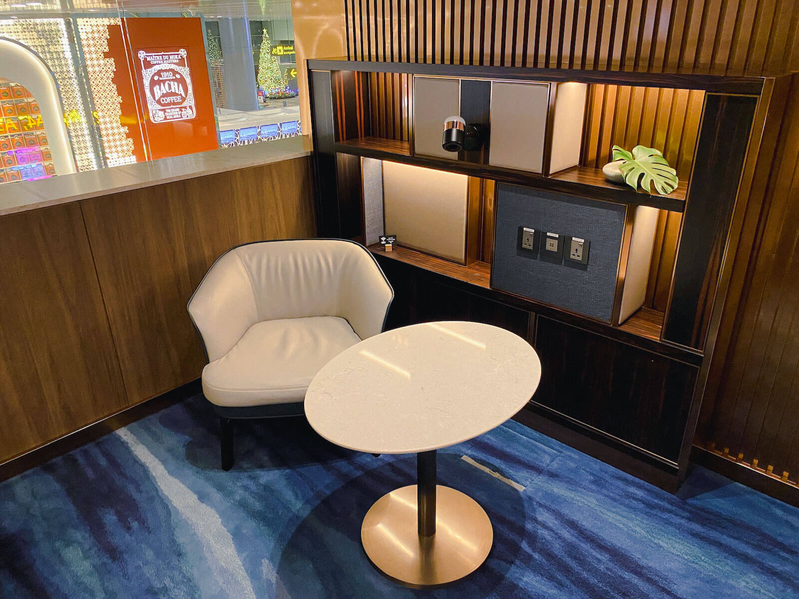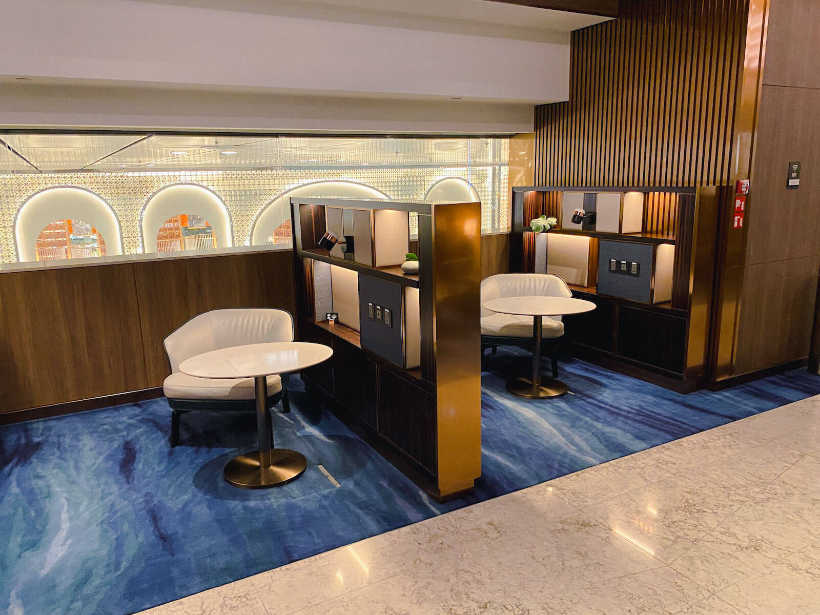 Auf der linken Seite der Lounge befinden sich einzelne Sitzplätze, die nicht so viel Privatsphäre bieten. Singapore Airlines hat hier eventuell ein bisschen Platz verschenkt, bzw. diesen hätte anderweitig nutzen können. Zusätzlich gibt es einen schallisolierten Raum für Gäste, die ein längeres Telefonat führen wollen und dabei ungestört sein möchten. Was direkt auffällt, vor allem bei den einzelnen Plätzen, sind die zahlreichen USB-Anschlüsse und Steckdosen, die man im alten Private Room teilweise vergebens gesucht hat. Vereinzelt haben die Tische eine integrierte Ladestation für das Smartphone. Am Ende der Lounge befindet sich das A-la-carte Restaurant.