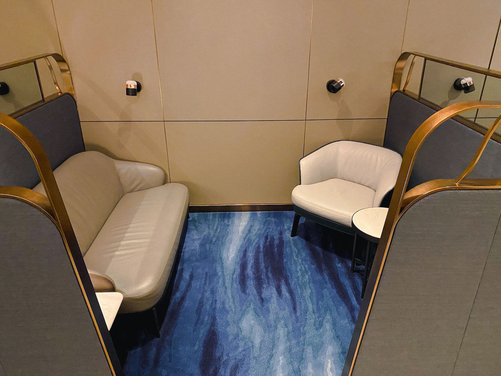 Was im Private Room fehlt, sind Arbeitsplätze. In den kleinen Einzelbereichen sind die Tische und Stühle definitiv zu niedrig, um zu arbeiten. Das würde auf Dauer mit Rückenschmerzen enden. Wer arbeiten möchte, sollte auf die neue First Class ausweichen, dort gibt es Schreibtische.