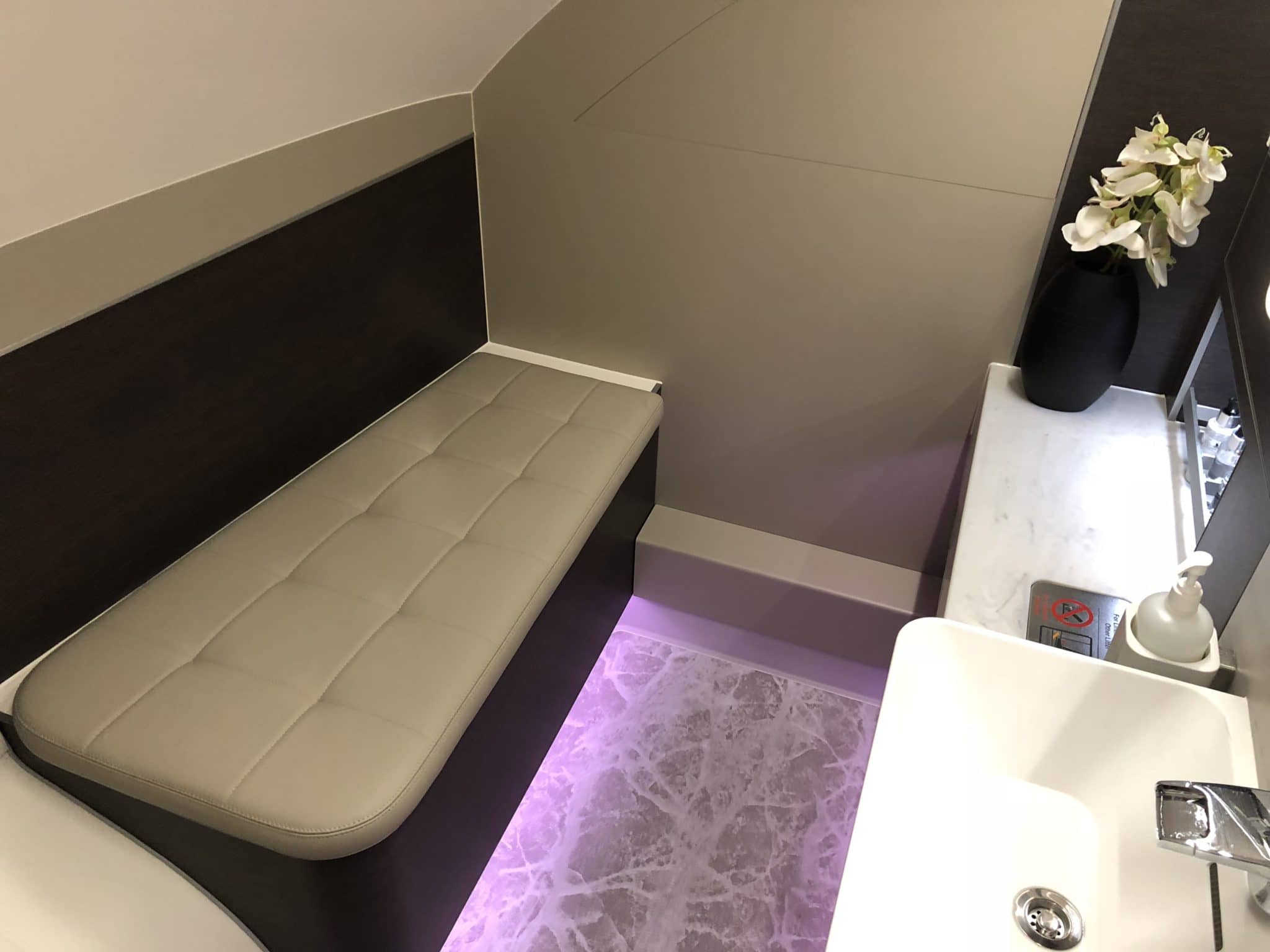 Überhaupt, wenn es an etwas nicht mangelt, dann ist es Platz. Wenn man so auf dem Sitz rumlungert kann man sich so lang machen wie man möchte, an das andere Ende der Suite reicht es dennoch nicht. Die indirekte Beleuchtung an der Decke, dem Boden und den Wänden, zusammen mit den Spots, leuchten die Kabine ideal aus und lassen die Suite wirklich gemütlich wirken.