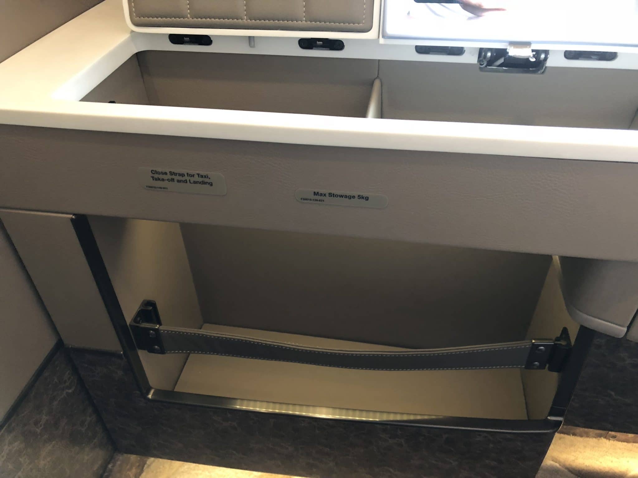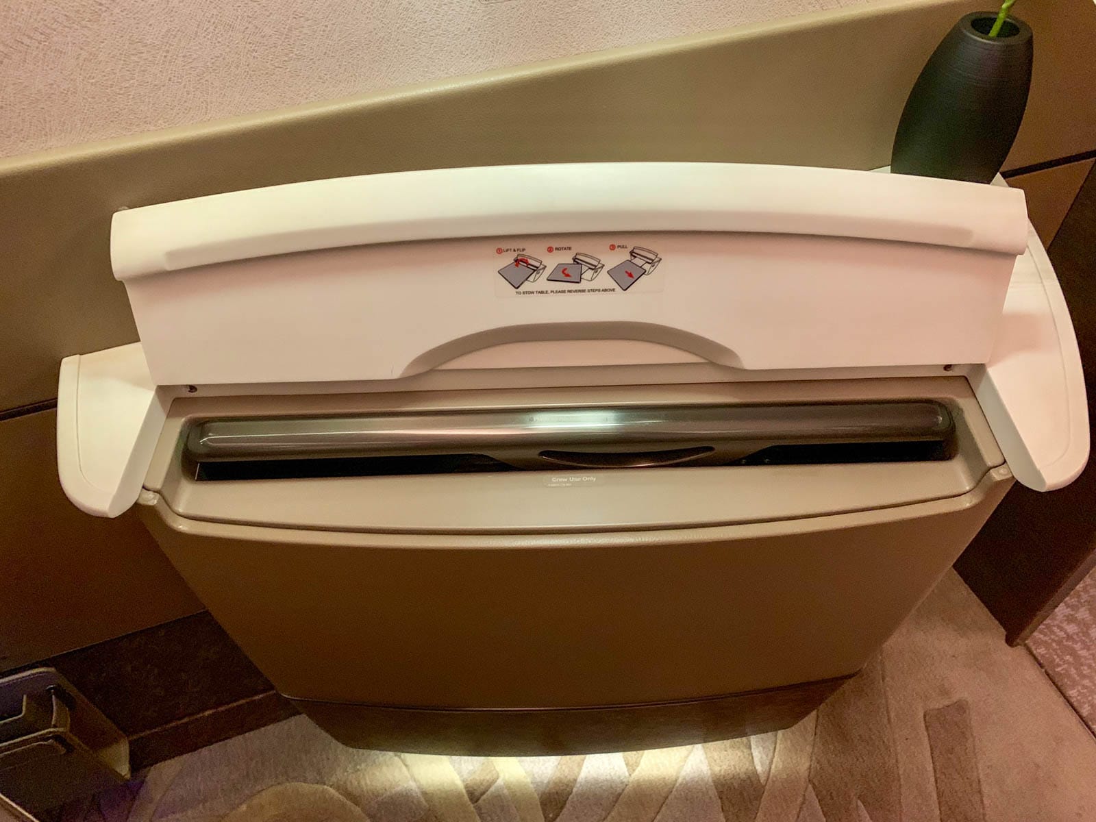 Zusätzlich gibt es noch weitere offene Flächen, wie die Auflagefläche für das Bett, wo bei Nichtgebrauch die Menükarte oder ein Getränk abgestellt werden können, das Tischchen neben dem Sitz, oder der Teil vor dem IFE Tablet, welcher aber strategisch schlecht platziert ist, da man beim Greifen nach dem Tablet Gefahr läuft, dass Getränk umzustoßen. Hinter dem Sitz befindet sich noch zu guter Letzt ein Zeitschriftenfach.