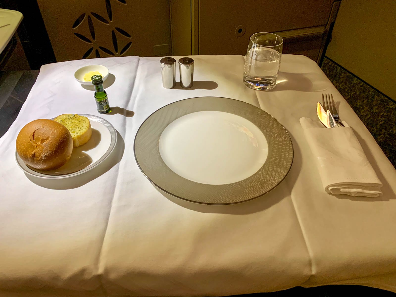 Mittlerweile war es schon nach 2 Uhr lokaler Zeit, und ich seit über 24 Stunden wach, so dass ich die Müdigkeit allmählich spürte und das Essen hinter mich bringen wollte. Man konnte wohl Gedanken lesen, denn noch während ich meinen Drink beendete wurde der Tisch herausgeholt und gedeckt, und das Festmahl konnte beginnen.
