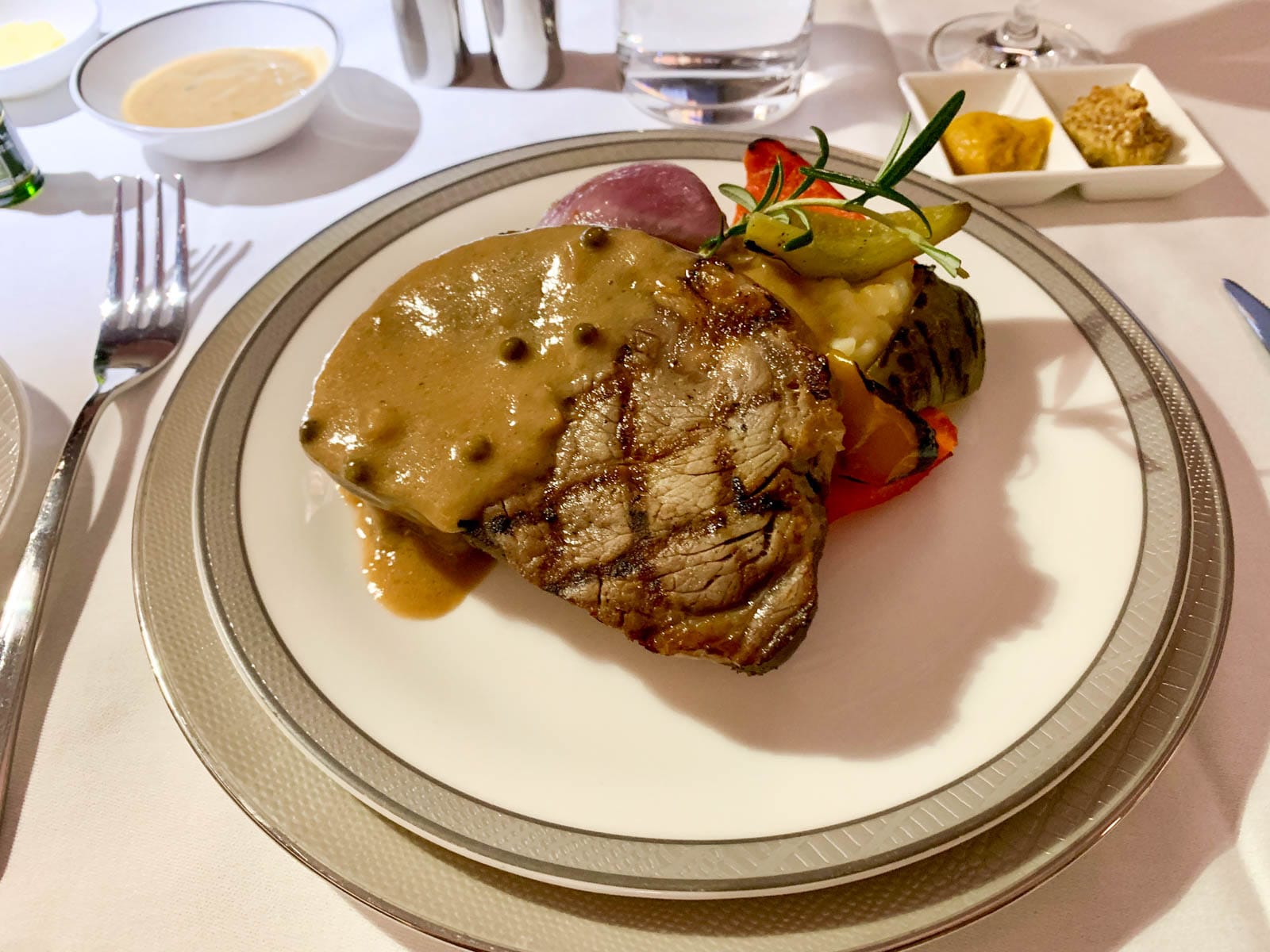Dann endlich war es soweit: Das wohl beste Stück Fleisch, dass ich je in einem Flugzeug gegessen habe (und auch einige nichtfliegende Restaurants hat es ausgestochen) wurde mir um etwa 2:30 Uhr serviert, zusammen mit einem Glas australischen Rotwein. Viel besser hätte man es wohl echt nicht servieren können, und der Koch an Bord hatte ebenso seine Freude über mein Lob für seine Zubereitung wie ich an seinem Essen. Das war auf den Punkt gebracht, jederzeit gerne wieder.