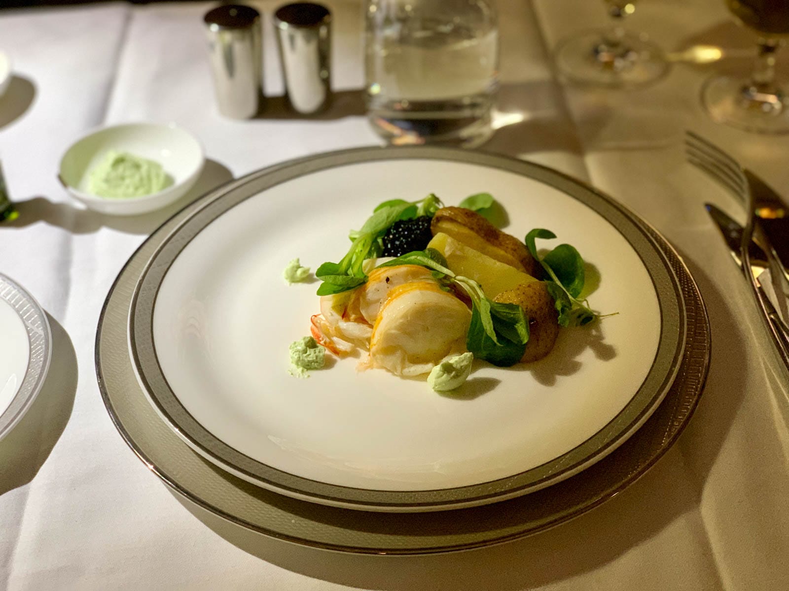 Los ging es mit einer Hummer Vorspeise und einem Brötchen mit Butter und Olivenöl. Beim Wein konnte ich die Auswahl auf zwei Weiße eingrenzen, worauf man mir kurzerhand beide zum “Probieren” einschenkte. Wenn doch nur überall das Wort Probieren so verstanden werden würde ;). Meeresfrüchte und -Getier sind so überhaupt nicht meins, also habe ich etwas vom Hummer probiert und den Kaviar gegessen, der Rest ging leider zurück. Der Hummer hat mich überrascht, denn weder im Book-the-Cook noch auf der Karte ist er mir aufgefallen.