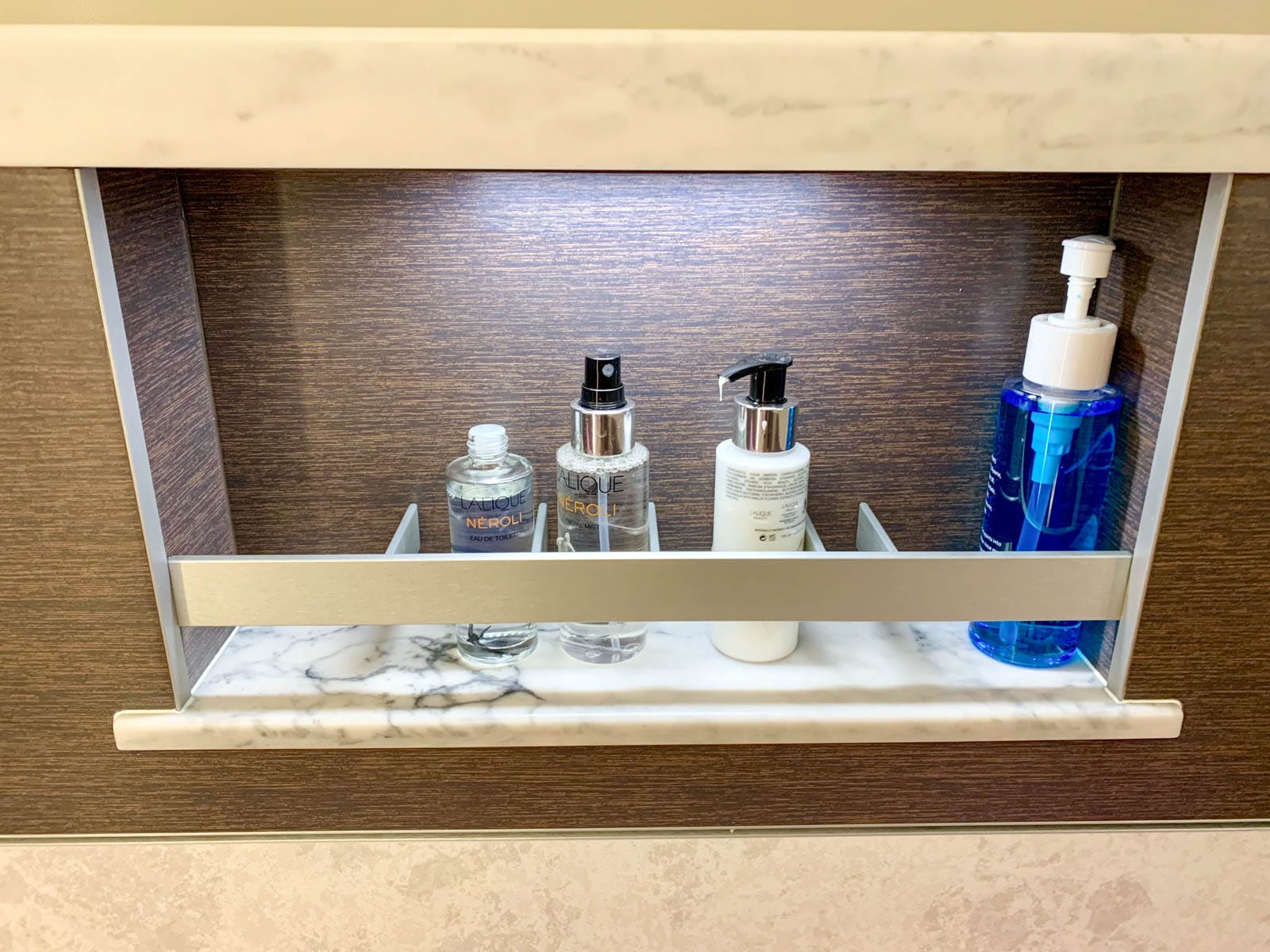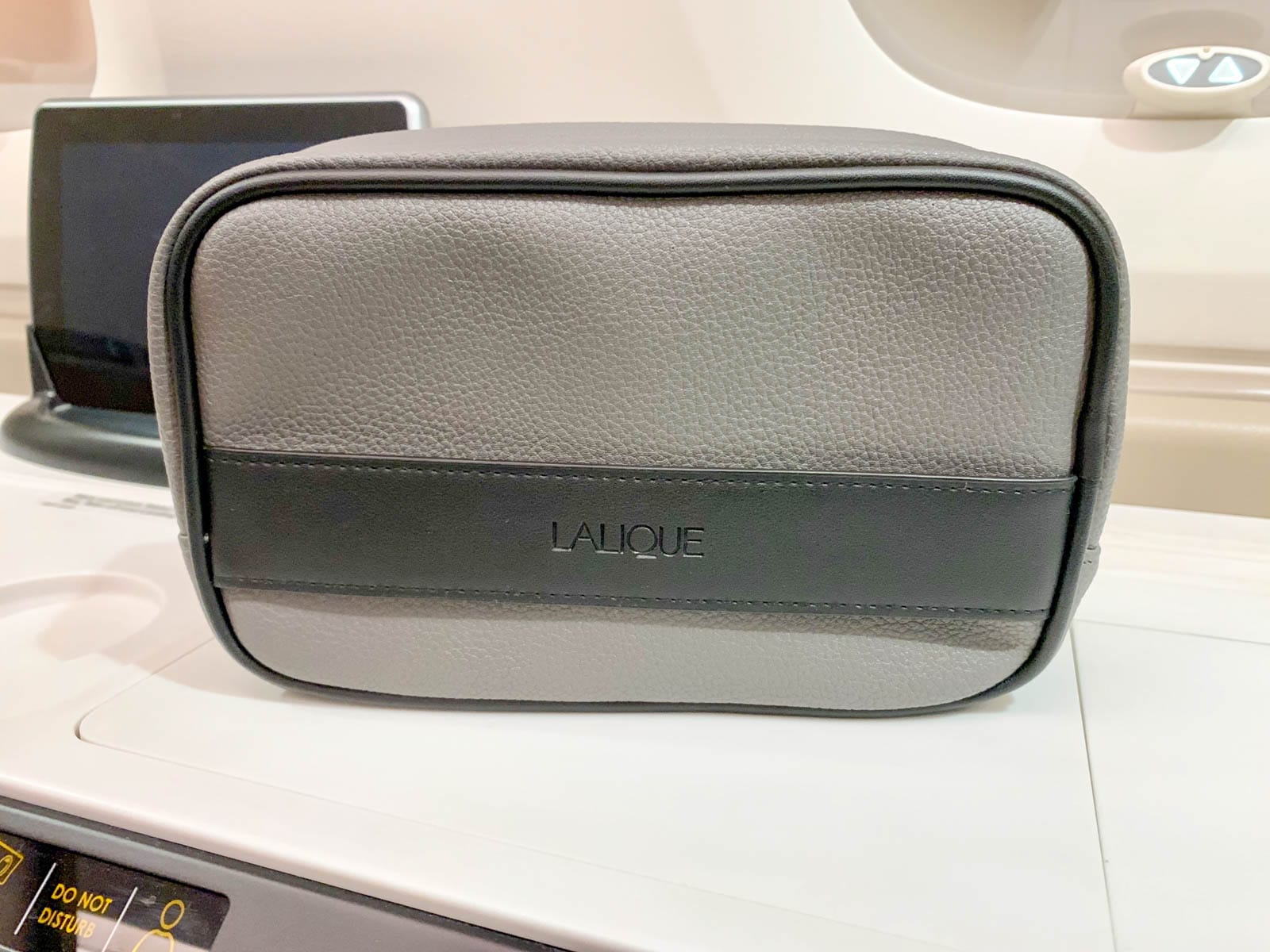Dann gab es noch das Amenity Kit, ebenfalls von Lalique, welches in einem der fensterseitigen Staufächer untergebracht war. Vom Design und Aussehen her ist es wohl mein bisher liebstes Amenity Kit, denn im Gegensatz zu jenen aus der Swiss First Class ist es noch einmal etwas größer und bietet damit den entscheidenden Platzvorteil. Es enthält Lip Balm, Gesichtsspray und eine Body Lotion sowie ein Eau de Toilette und eine Schlafmaske. Übrige Amenities wie eine Zahnbürste oder einen Kamm gab es im Bad.