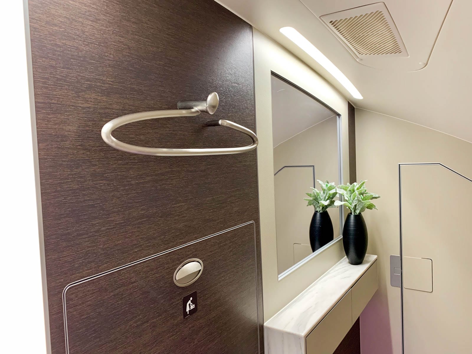 Für die 6 Passagiere in der Suites Class gibt es 2 Badezimmer, welche sich beide ganz vorne links und rechts der Treppe befinden. Das linke (Bilder 1 und 2) ist dabei schon ziemlich geräumig, aber das rechte (Bilder 3-8) ist fast schon eine Suite für sich! Und das Design verstärkt diesen Eindruck nur noch zusätzlich mit kleinen Details wie schon in der Kabine.