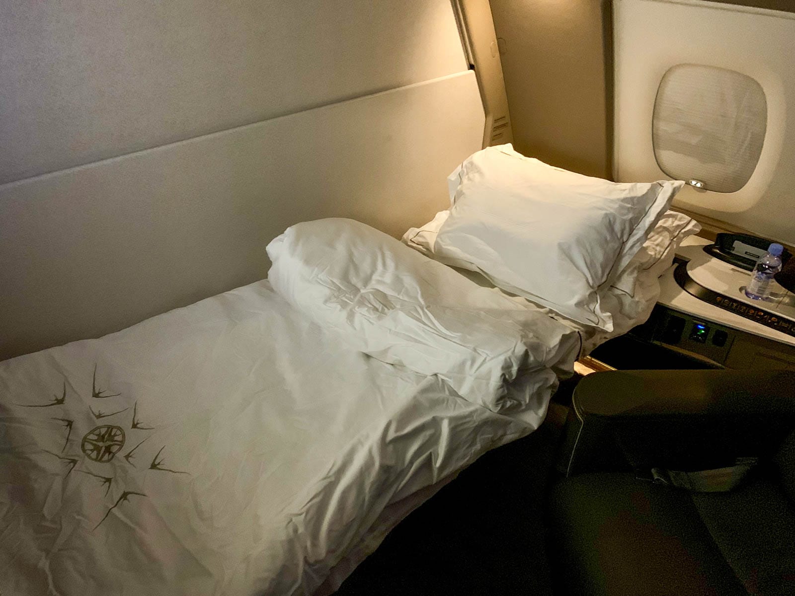 Das Bett ist natürlich kein Queen Bett in der Breite, allerdings fand ich es ziemlich bequem und habe gute 8 Stunden geschlafen. Im Gegensatz zu herkömmlichen First Class Sitzen gibt es hier keinen spürbaren Übergang von der Lehne zur Sitzfläche, was mir sehr gut gefallen hat.