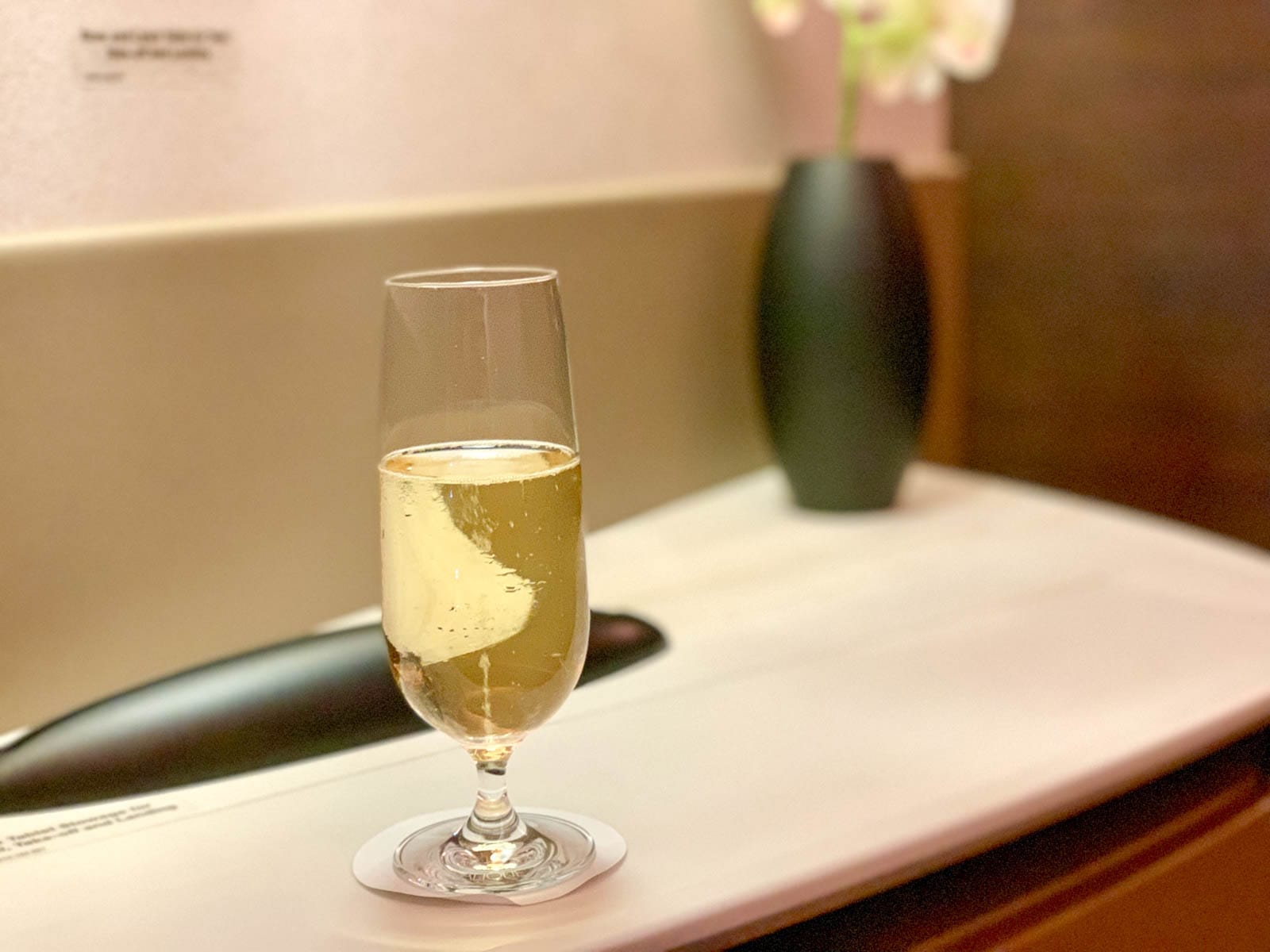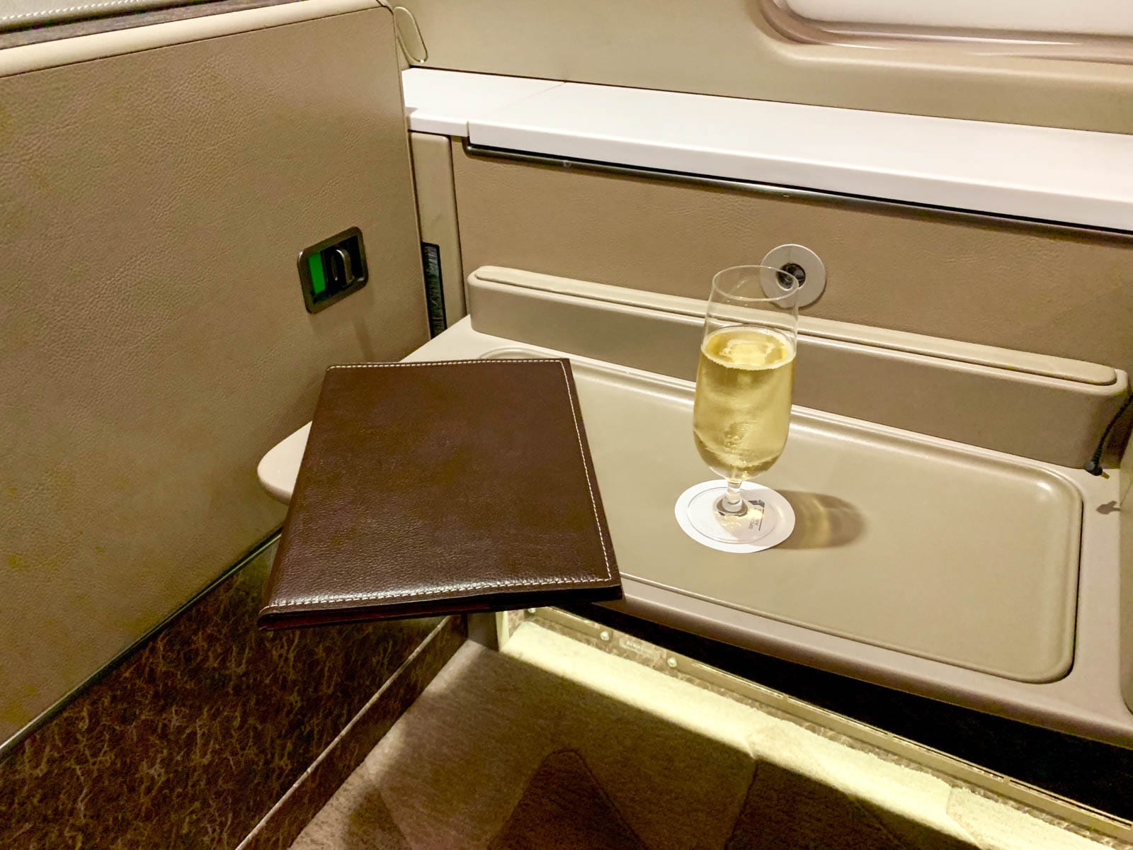 Kaum an Bord wurde ich umgehend von den Flugbegleitern der Suites Class in Empfang genommen und zu meiner Suite 2F geführt. 2F ist die mittlere Suite auf der rechten Seite und ließe sich im Falle des Zusammenreisens mit 1F in eine Doppelsuite verwandeln, inklusive Doppelbett. Nach einer kurzen Erklärung zu den Stauräumen und Spezialitäten der Suite hat man mir direkt die Wahl zwischen Krug 2004 und Dom Pérignon Vintage 2009 gelassen. Ich habe mich für letzteren entschieden und die Suite bei einem Glas Champagner auf mich wirken lassen.