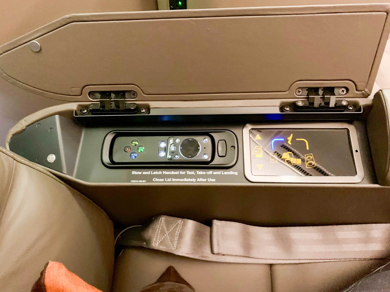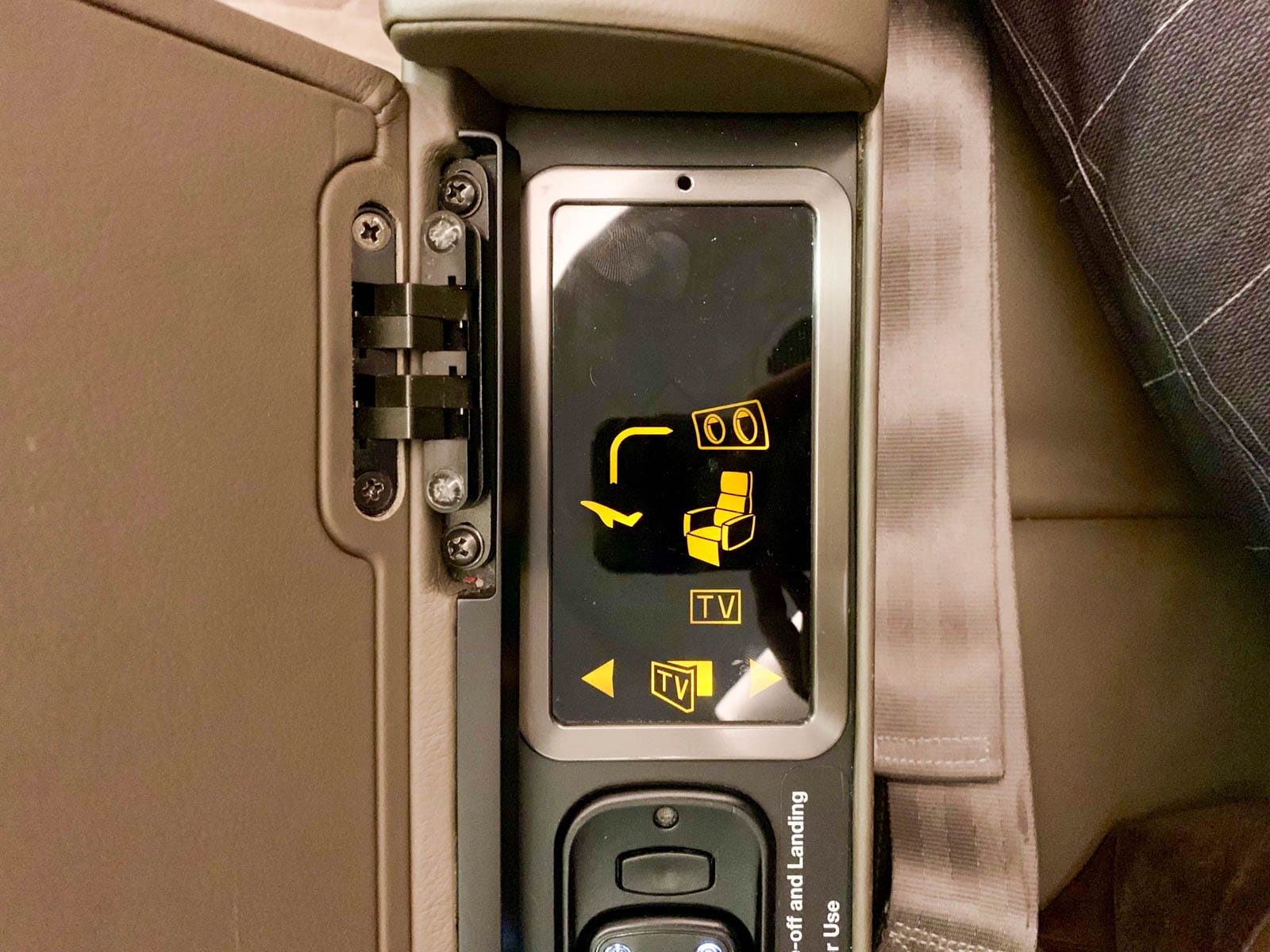In der linken Armlehne des Sessels befinden sich außerdem ein weiterer IFE Controller sowie Bedienelemente für den Sitz und den TV, für welche ihr damit jeweils die Schwenkung bestimmen könnt. Was am Anfang etwas überwältigend wirkt, ist nach kurzem Betrachten und Herumspielen schnell klar und intuitiv nutzbar.