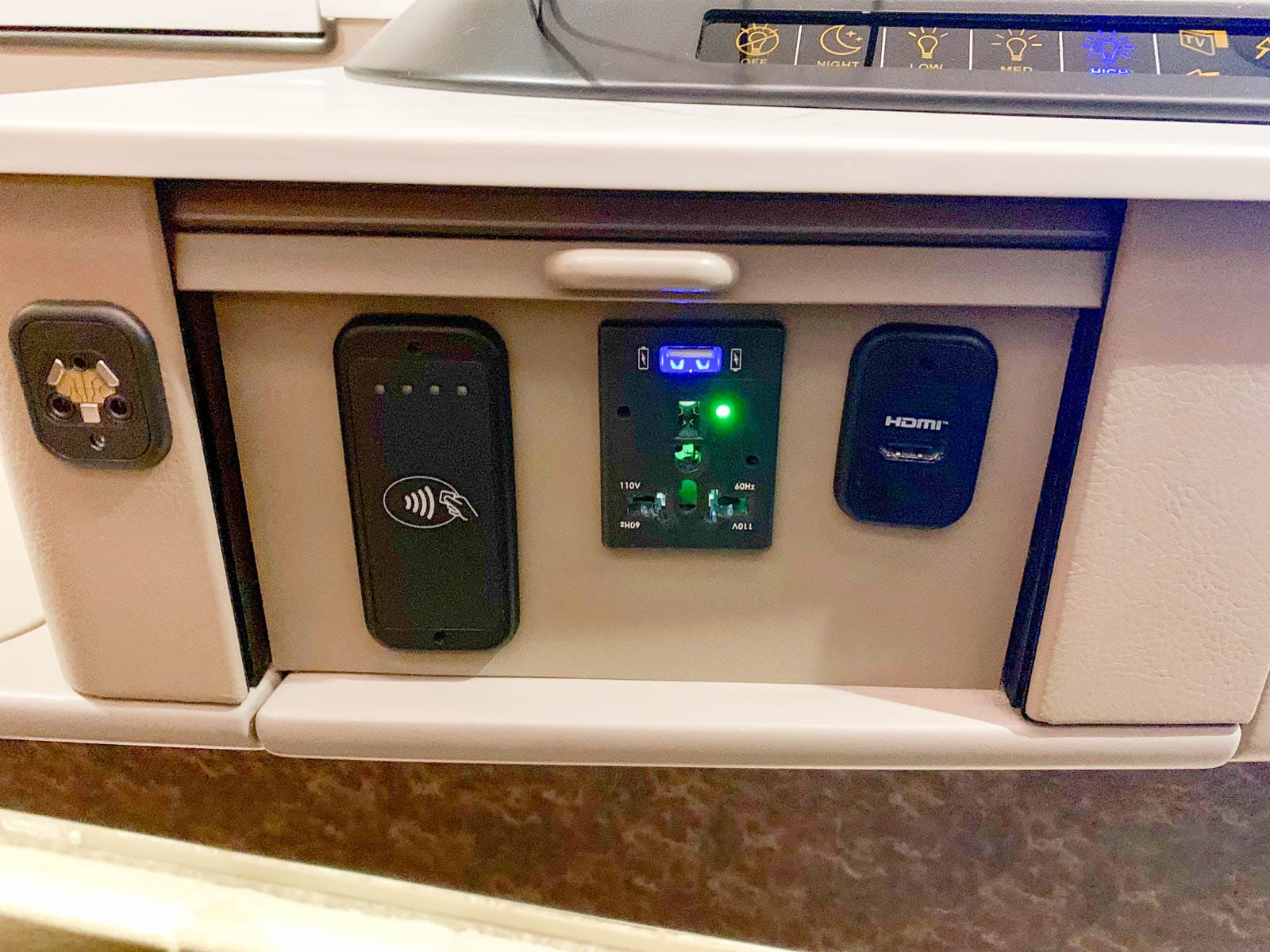 Wer zum Arbeiten oder auch Vergnügen Strom benötigt hat die Auswahl. Am Beistelltisch gibt es einen Strom- und USB Anschluss in Richtung des Sessels, ein weiterer befindet sich, zusammen mit dem Kopfhöreranschluss und einem HDMI-Eingang, unter den fensterseitigen Bedienelementen.