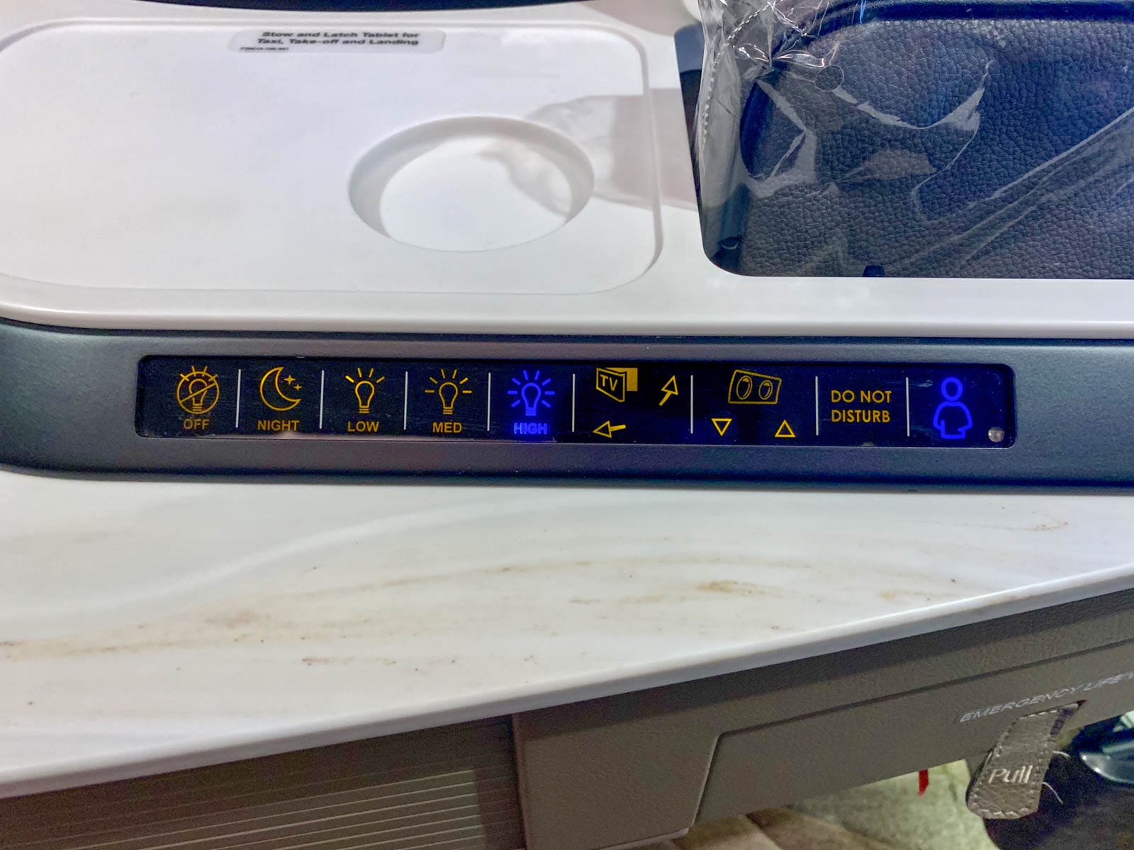 Dann wären da noch die Bedienelemente. Fensterseitig wären da zum einen das drahtlose IFE-Tablet und dessen Station, mit dem sich glaube ich auch gewisse Kabinenelemente bedienen lassen, sowie eine Reihe an Funktionen für die Beleuchtung, die TV-Schwenkung, die Rollläden für die Fenster, und den Service.