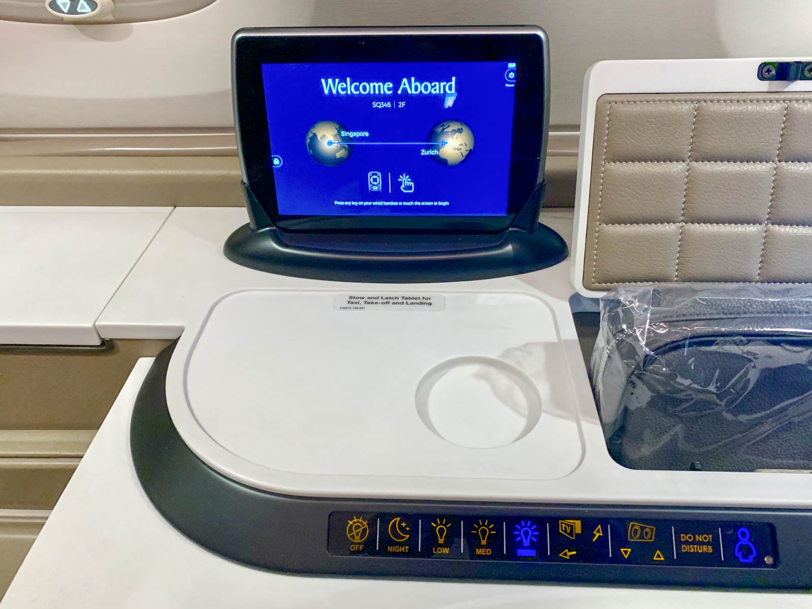 Das Entertainment System im A380 von Singapore Airlines ist so ziemlich auf dem neusten Stand. Zum einen haben wir den 32 Zoll großen Monitor am Fußende des Bettes sowie den drahtlosen IFE Controller am Fenster und noch einen weiteren Controller in der Armlehne des Sitzes. Für das IFE Tablet gibt es offenbar irgendeine Sperre, die das Herausnehmen desselbigen verhindert. Diese Sperre hat sich hin und wieder von selbst aktiviert, so dass man etwas herumfummeln musste, bis es wieder ging. Ob das eine einmalige Sache bei mir war, oder ob das Problem häufiger vorkommt weiß ich nicht. Übrigens gibt es eine zweite Basisstation für das Tablet auf dem Tisch neben dem Sessel, so dass man sich während des Essens nicht ständig umdrehen muss.