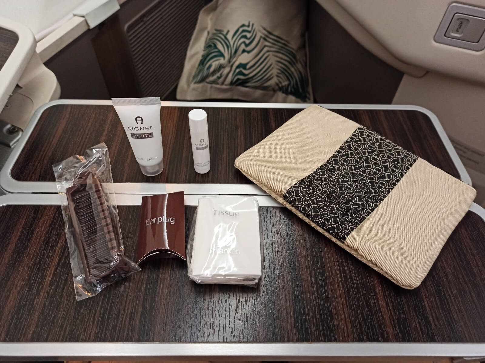 Auf den beiden Mittelstrecken, die ich zuvor in der SriLankan Airlines Business Class geflogen bin, wurden keine Aminity Kits ausgeteilt und nur Socken bzw. Socken zusammen mit einer Schlafmaske zur Verfügung gestellt. Deshalb war ich gespannt, ob dies auf einem deutlich längeren Nachtflug der Fall wäre. Auf dem Flug nach Frankfurt warteten wieder Schlafmaske und Socken sowie ein paar Schlappen schon am Platz. Vor dem Start wurden dann tatsächlich noch Amenity Kits der Marke Aigner ausgeteilt. Darin befanden sich Ohrstöpsel, Taschentücher, Handcreme, Lippenbalsam sowie ein Kamm. In der Toilette der Business Class waren zudem Handcreme, Mundspühlung, Parfüm und Zahnbürsten (nur in der rechten Toilette) zu finden. Die Schlafmaske fand ich bemerkenswert angenehm und leicht verstellbar.