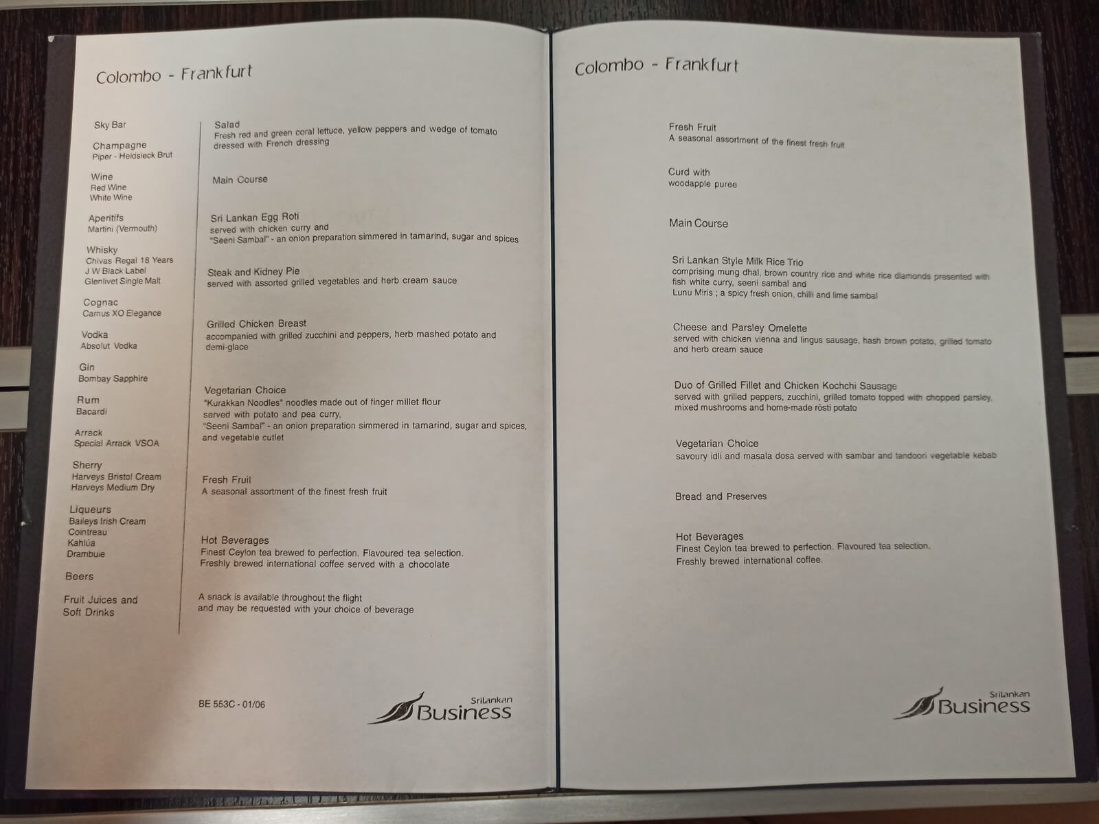 Zur Begrüßung bot uns die Flugbegleiterin am Platz eine Auswahl an Champagner und Säften an. Ein heißes Tuch wurde nicht gereicht. Nach unseren Essenswünschen für das Abendessen und für das Frühstück erkundigte sich die Crew dann kurz nach dem Start und brachte zudem eine Schale mit Nüssen. Wie ihr der folgenden Speisekarte entnehmen könnt, standen auf der Strecke von Colombo nach Frankfurt jeweils vier Gerichte pro Mahlzeit zur Auswahl. Nach jeder Mahlzeit werden Tee- und Kaffeespezialitäten angeboten.