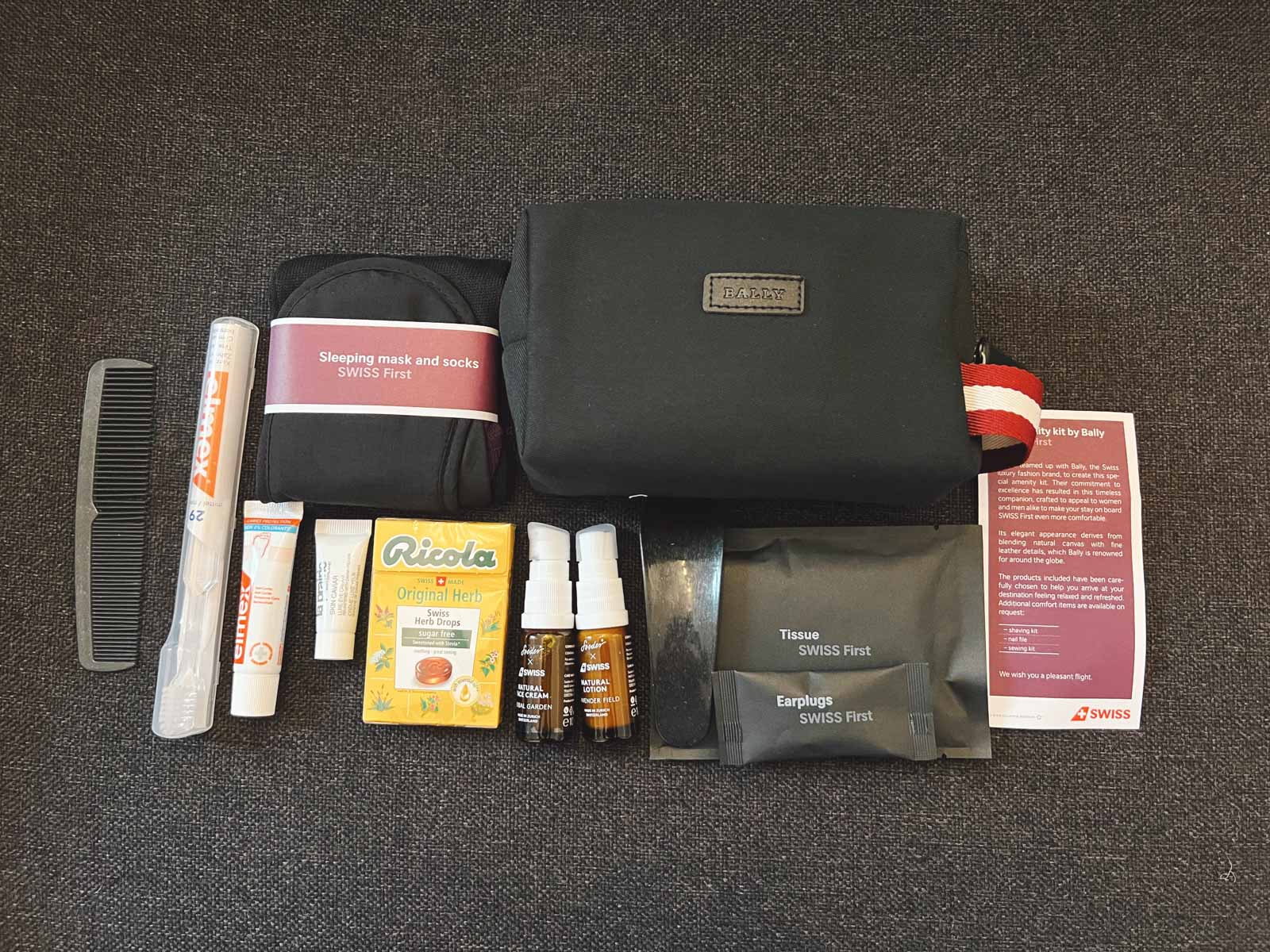 Das Amenity Kit von Swiss ist nach wie vor von Bally und beinhaltet die üblichen verdächtigen Gegenstände: Kamm, Zahnbürste und Zahnpasta, Lip-Balm, Ricola Bonbons, einen Schuhlöffel, Überziehsocken sowie zweierlei Sprays. Alles in allem solide, aber auch nichts außergewöhnliches.