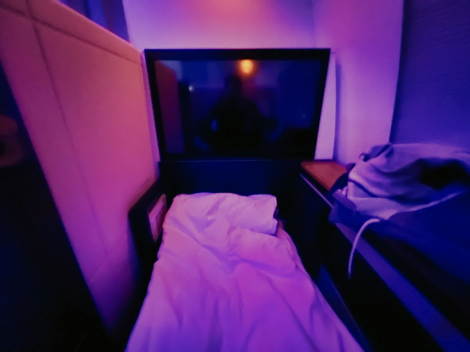 Türen im Flugzeug sind ja immer so eine Sache, manche wollen sie um jeden Preis, andere auf keinen Fall. Ich selbst bin indifferent was Türen am Sitz im Flugzeug betrifft, weder stören sie mich noch nutze ich sie wirklich. Wenn mich jemand beim Filme schauen oder Schlafen beobachten möchte soll er das gerne machen. Bei der Swiss First Class hat die Türe einen weiteren Zweck – sie dient als Garderobe für die Kleider. Nachdem ich den Pyjama angefragt hatte wurde mir direkt angeboten das Bett zu machen, was ich dankend angenommen habe. Als ich aus dem Bad kam war das Bett mit Matratzenauflage und Bettdecke und Kopfkissen gerichtet und ich habe versucht etwas zu schlafen.
