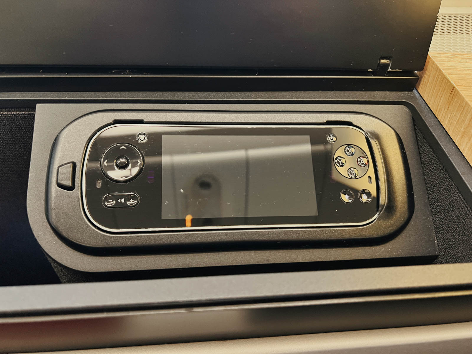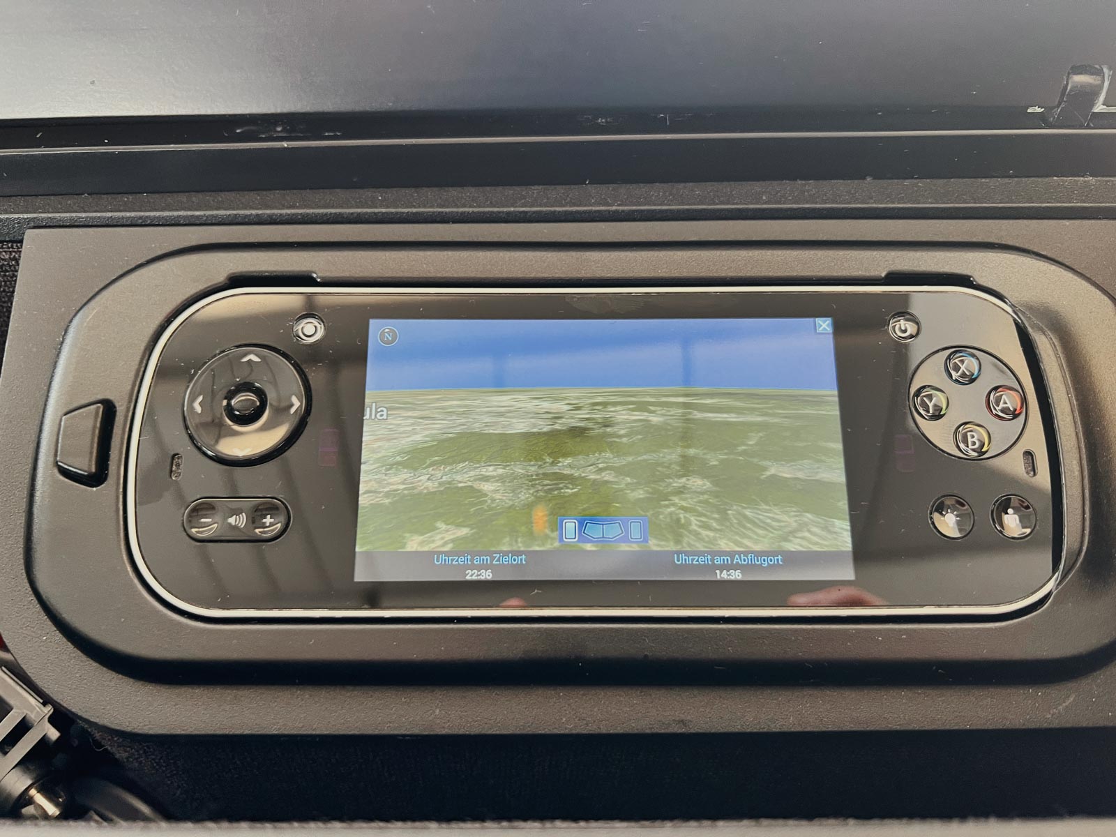 Mit dem IFE Controller lässt sich die Auswahl auf dem Monitor steuern, er kann für die Airshow allerdings auch separat genutzt werden, so dass ihr auf dem großen Bildschirm einen Film schauen könnt während nebenher die Airshow auf dem Handheld läuft.