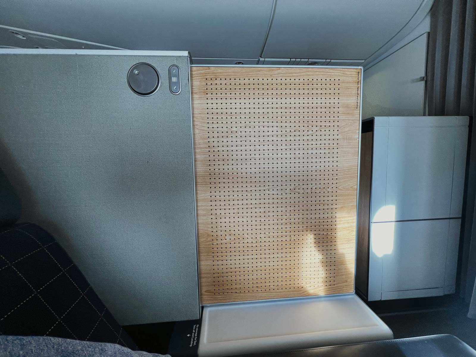 Hierzu wird der massive Holztisch aus der Seitenkonsole vorne herausgeholt und eingedeckt. Dieser ist groß genug damit zwei Passagiere sich gegenüber sitzen und essen können, was bei Swiss tatsächlich auch eine Option ist. Der Tisch lässt sich auch problemlos so weit verschieben, dass ein Aufstehen möglich ist.
