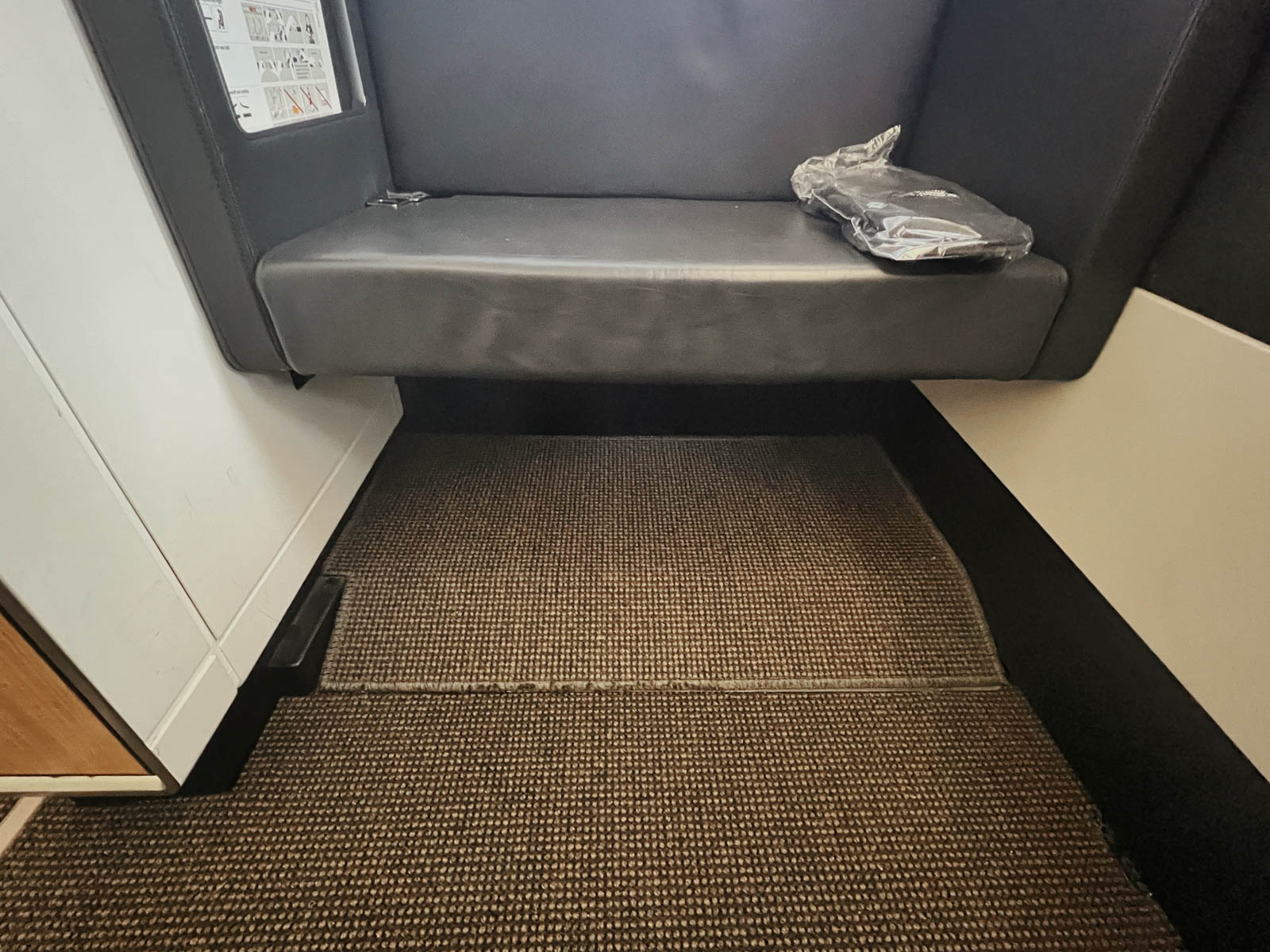 Die Suite ist etwa zwei Meter lang und mit Ablage schätzungsweise 80cm breit und bietet mehr als genug Platz sich auszubreiten. Die seitliche Ablage ist ideal um Gläser, Snacks oder Flaschen darauf abzustellen bzw. auf dem Gitter einen Pullover zu deponieren, während man in der Loungeposition auf dem Sitz herumlungert und einen Film anschaut. Der breite Sitz und der ebenso breite Ottoman laden geradewegs dazu ein.