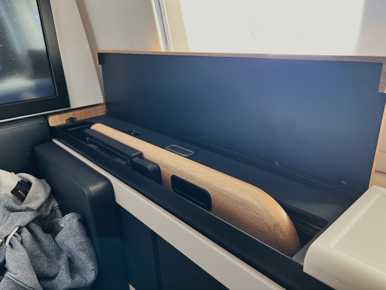 Außerdem gibt es an der Decke ein weiteres Licht sowie seitlich ein Leselicht, welches sich aufklappen lässt. Hier befindet sich auch die Bedienung für den Sichtschutz, welcher sich elektrisch ein- und ausfahren lässt.