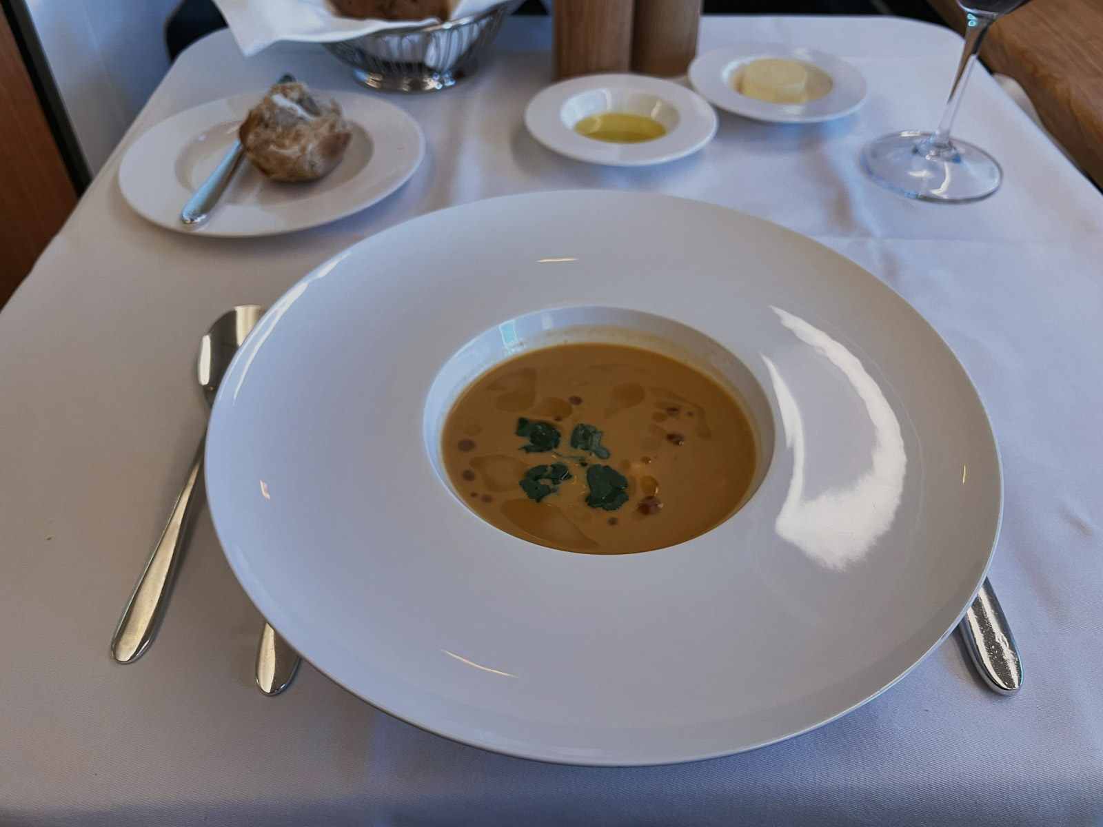 Nach dieser nicht ganz ungerechtfertigten Kritik gibt es nun allerdings umso mehr Lob, und zwar verdientermaßen. Noch vor dem Pushback gab es das Amuse Bouche zusammen mit einem warmen Tuch und verschiedenen Getränken. Nachdem wird dann die Reiseflughöhe erreicht hatten ging es auch schon mit dem Service los. Da ich gerade erst in der Lounge gegessen hatte habe ich das Mittag/Abendessen um ein paar Stunden verschoben, was problemlos möglich war.