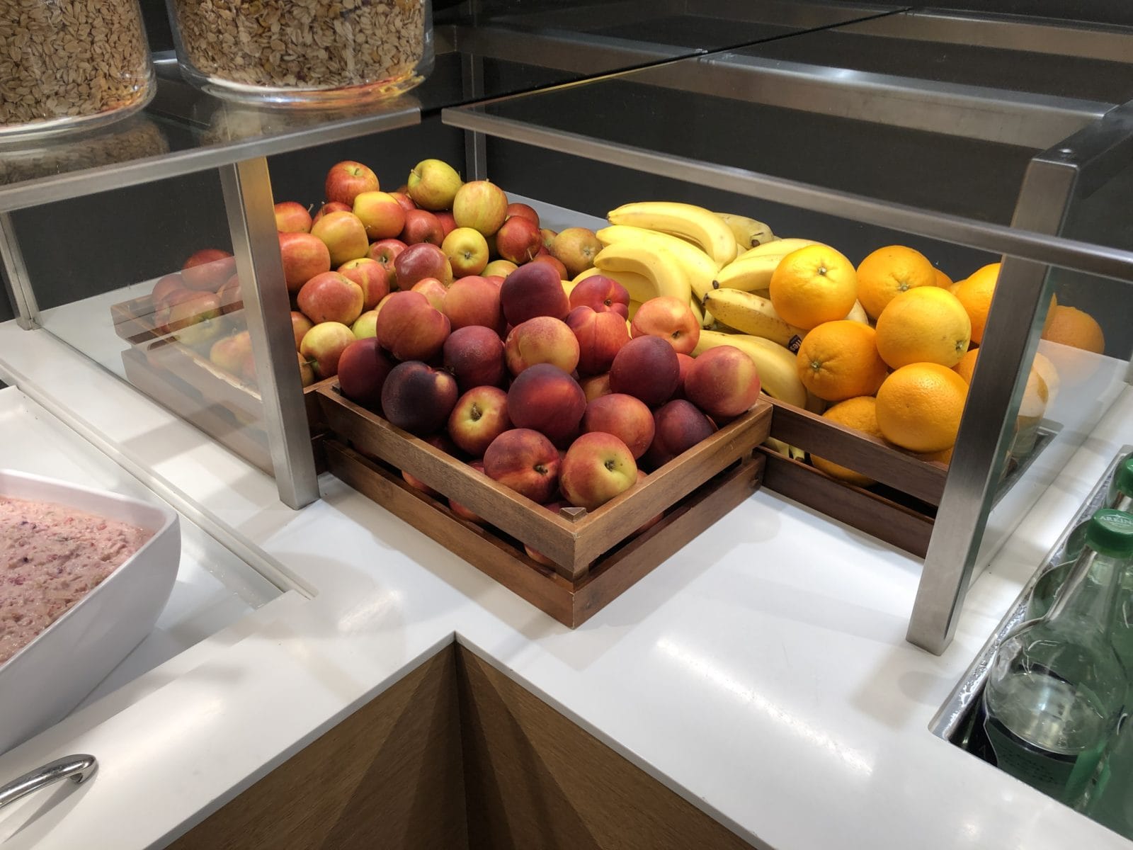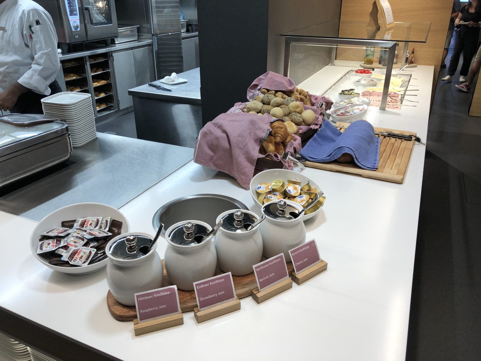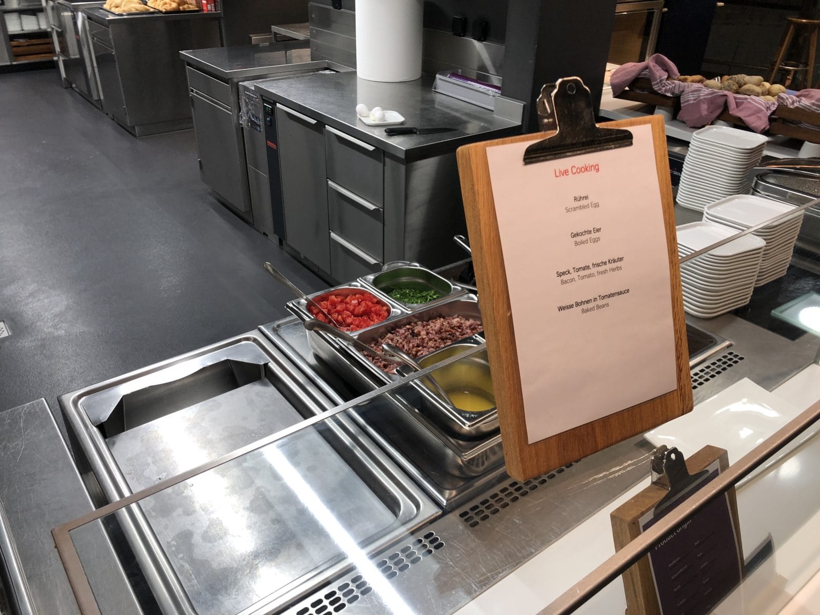 Die Auswahl zum Frühstück entspricht dem üblichen Standard der Swiss Lounges. Es gibt eine Müsli-Bar, Joghurt, Aufschnitt, Brot, unterschiedliche Sorten Marmelade, Muffins und Süßigkeiten. An der Live Cooking Station könnt ihr euch vom Koch ein Spiegelei zubereiten lassen oder ihr greift auf das Rührei zurück, welches bereits in einer Buffet-Schale fertig zubereitet ist. Der Koch mixt dieses gerne mit Bacon und frischen Kräutern für euch. Am Abend werden an der Cooking Station Pasta und Reisgerichte serviert.