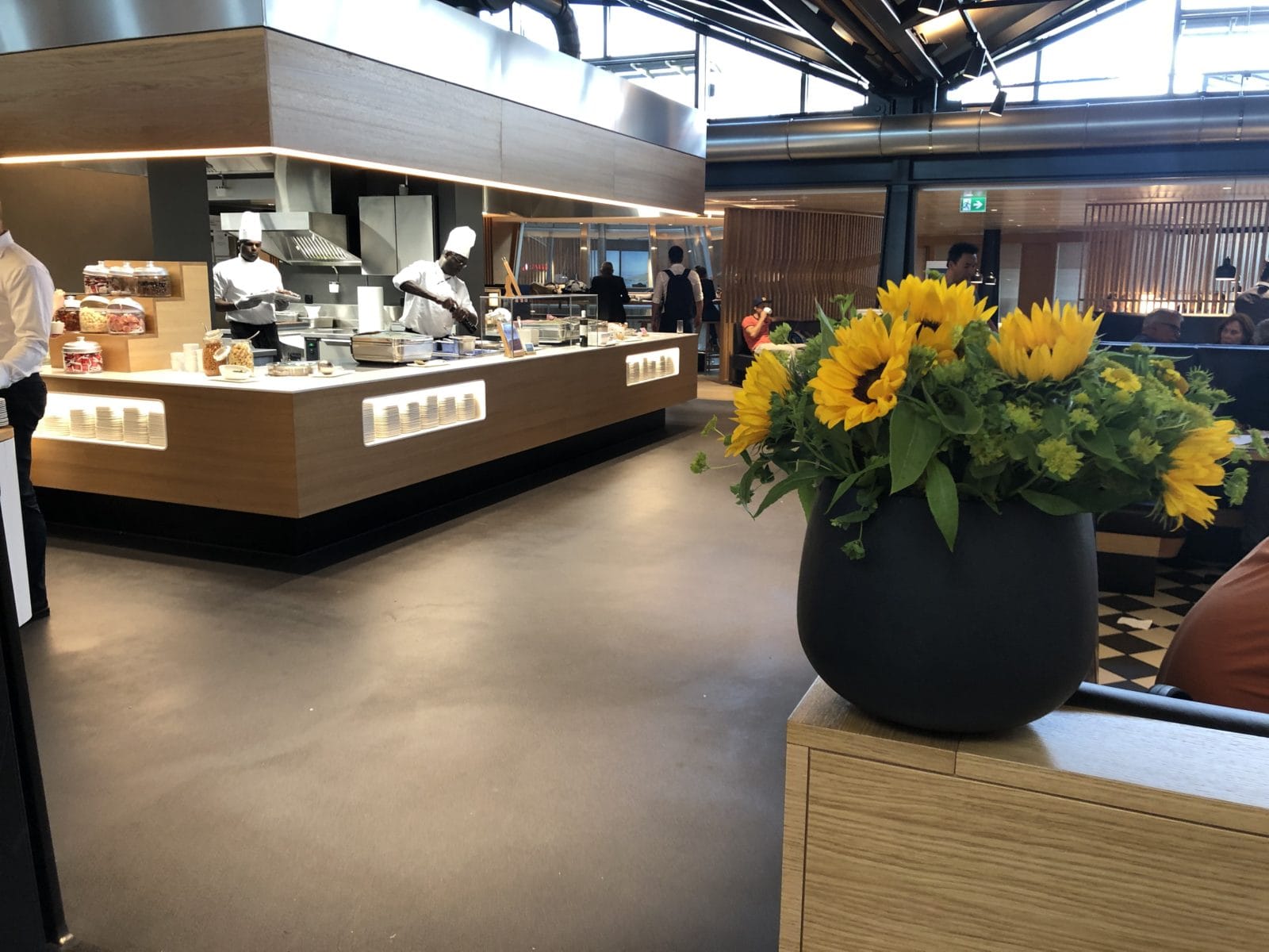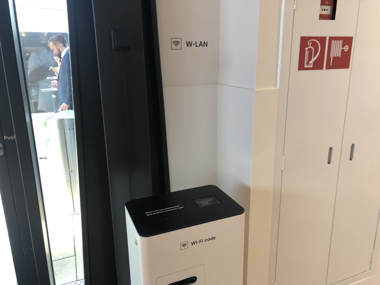 Im mittleren Teil der Lounge befindet sich der Essbereich samt Live Cooking Station und Buffet. Im hinteren Teil der Lounge sind Sessel, Barhocker und Arbeitsplätze. Hier findet ihr ausreichend Möglichkeiten euer Smartphone, Tablet oder Notebook zu laden. Eine Treppe führt nach oben zum Ruhebereich. Hier befinden sich größere Sofas und Liegen, die einen Blick auf das Rollfeld bieten. Hinzu kommen kleine Fernseher, vor denen manchmal bis zu drei Stühle aufgebaut sind. Wer es also kuschelig vor dem Fernseher mag, ist hier genau richtig. In der Nähe der Eingangstreppe befindet sich ein Außenbereich für die Raucher, die Toiletten und eine Auswahl an Zeitungen und Zeitschriften. Ebenfalls an der Eingangstreppe steht eine WiFi Maschine, wo ihr euer Ticket scannt und daraufhin einen WiFi Code erhaltet. Folgend eine kurze Auflistung was die Swiss Senator Lounge A zu bieten hat: