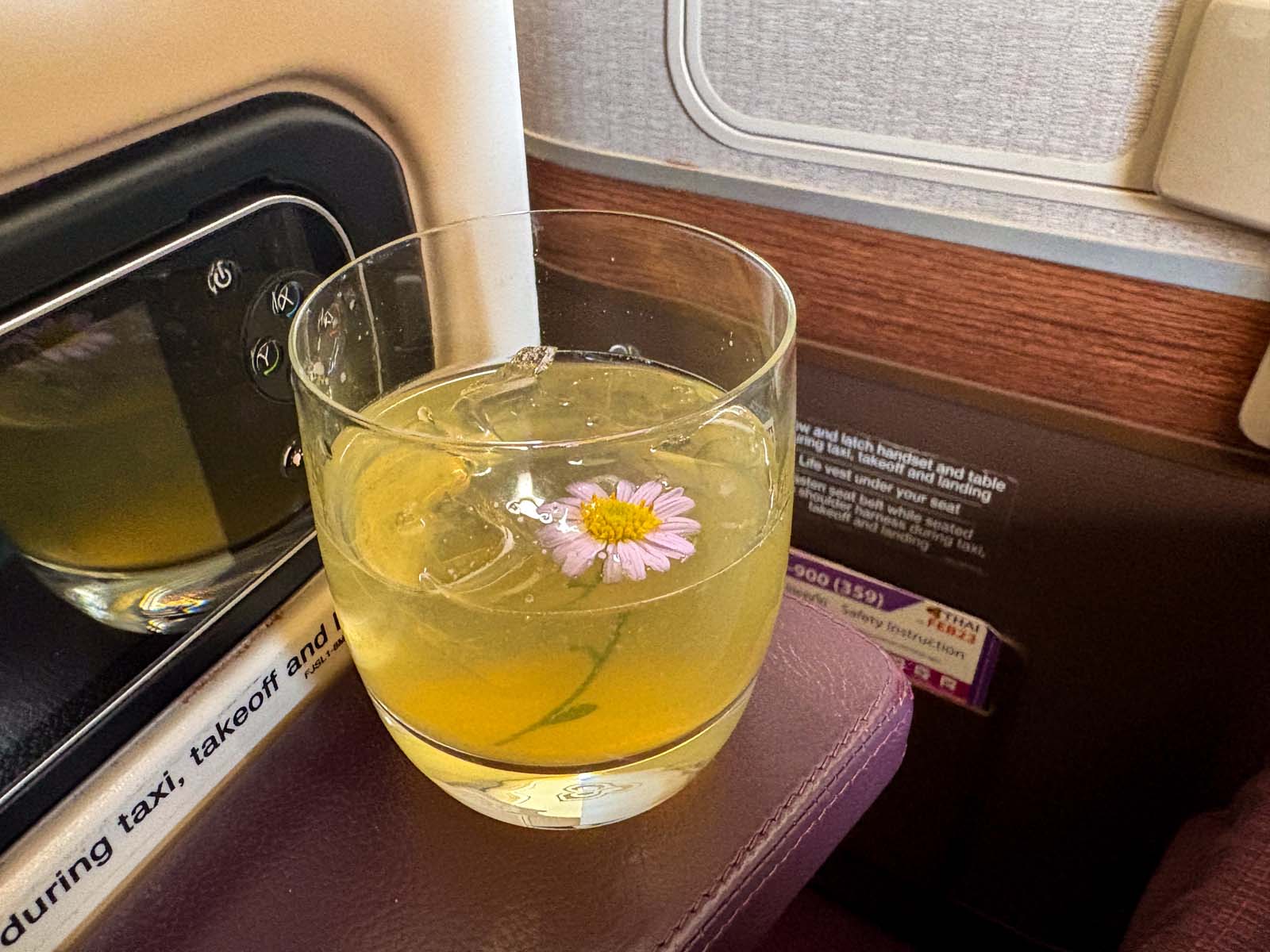 Geboardet wurde über Tür 2L. Links ging es in die Business Class, rechts weiter in die Economy Class. Kaum hatte ich meinen Sitz eingenommen, wurde mir bereits ein Welcome Drink angeboten. Neben Champagner, Orangensaft und Wasser wurde auch der Thai-Signature Drink Violet Bliss angeboten – ein lilafarbenes Getränk auf Basis von Butterfly Pea Flower und Limettensaft. Dazu reichte die Crew ein heißes Handtuch und kurz darauf wurden auch schon die Essenswünsche für das Mittagessen abgefragt.