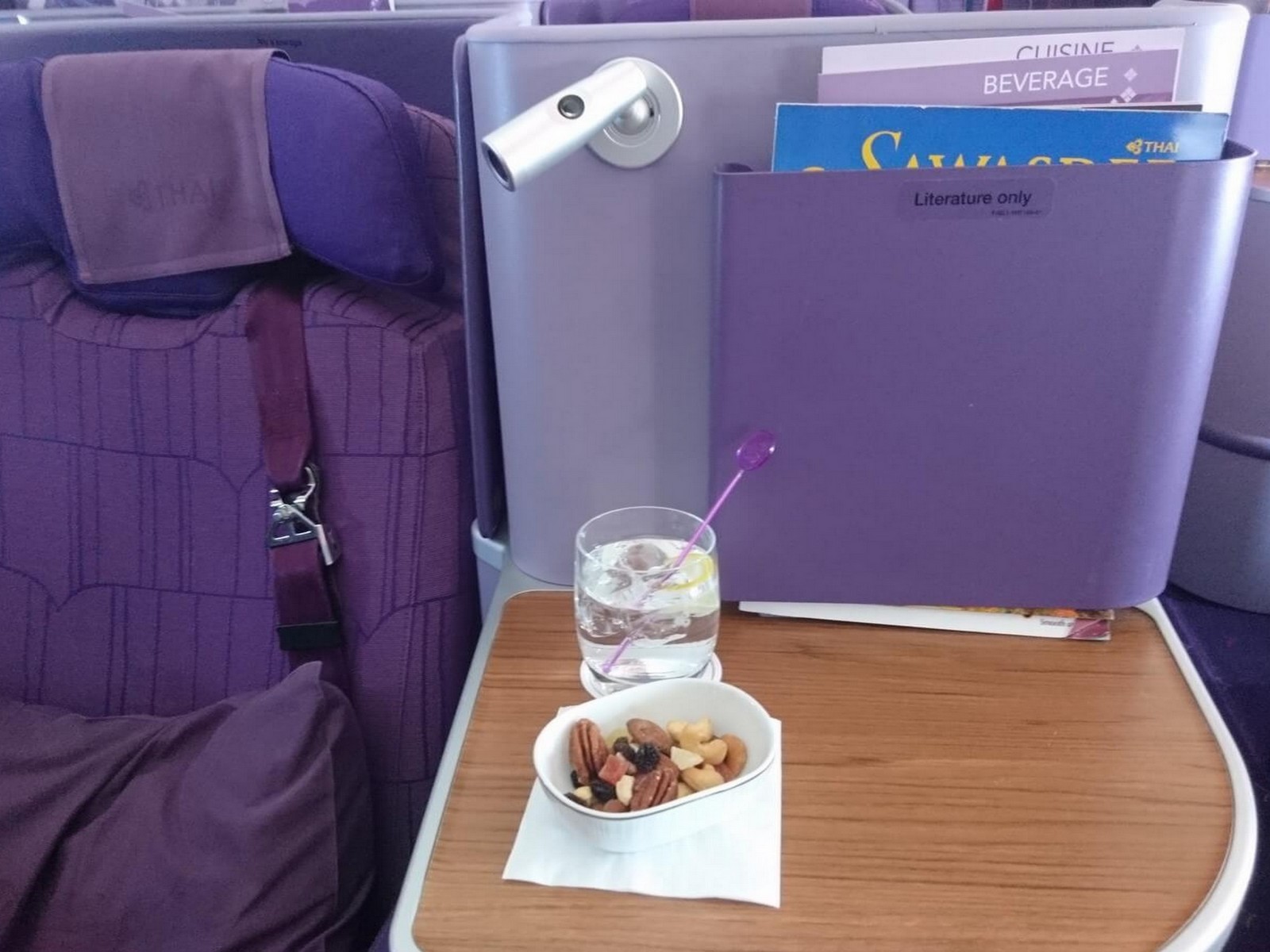 Die Flugbegleiterin begrüßte uns am Platz, stellte sich uns vor und teilte uns die Flugdauer nach Bangkok mit. Sofort wurde uns Champagner angeboten, den wir sehr gerne annahmen. Nebenbei wurde uns eine Auswahl an Zeitschriften angeboten. Die getrennten Speise- und Getränkekarten fanden wir bereits am Platz vor, zusammen mit dem Bord- und Duty Free-Magazin. Noch vor dem Start erkundigte sich die Flugbegleiterin, welches Getränk sie uns bringen dürfe, sobald wir die Flughöhe erreicht hätten. Dabei empfahl sie uns den Signature Cocktail namens Flying Blue, bestehend aus Gin, Tonic und einem Spritzer Violet Bliss, der passend für die lila Farbe sorgte. Auch nach unseren Essenswünschen erkundigte sie sich noch am Boden. Wie ihr der folgenden Speisekarte entnehmen könnt, standen zur Auswahl ein Thailändisches, ein Japanisches und ein Westliches Menü – wir wählten beide Thai.