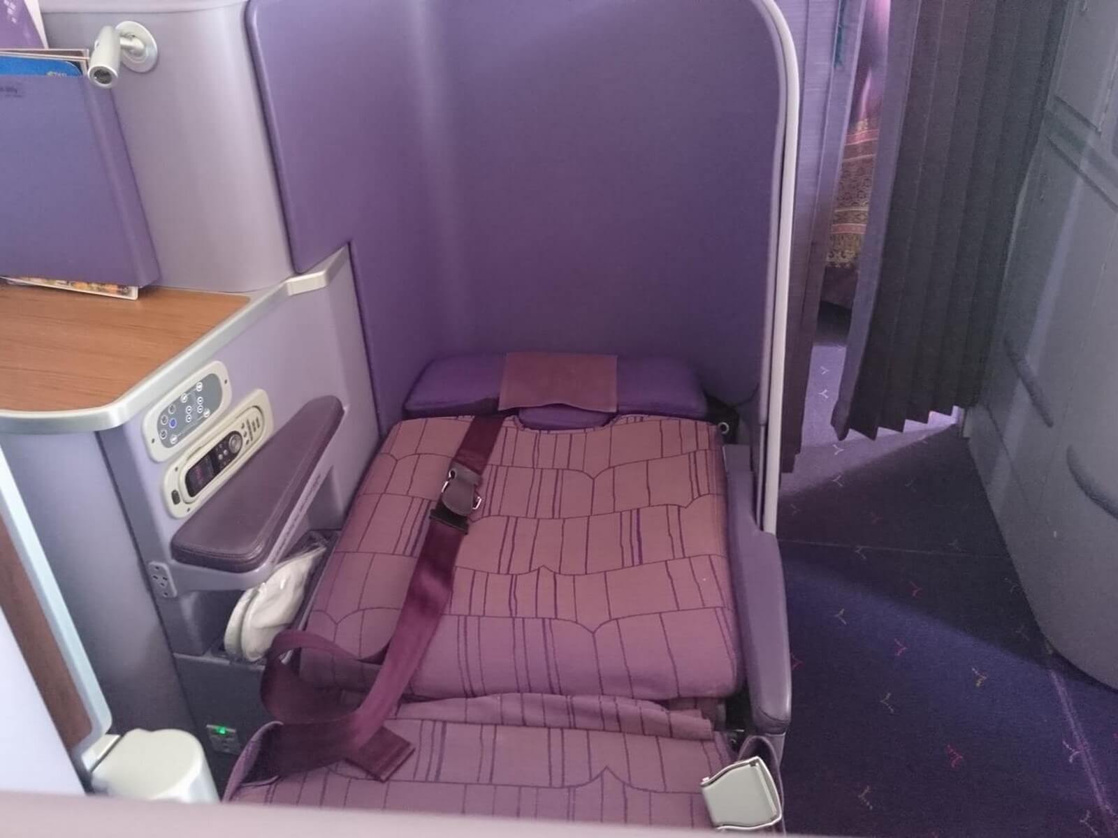 Obwohl es ein Tagflug war, habe ich meinen Sitz zu einem Bett ausgefahren, um ein kurzen Power Nap zu machen. Dabei hätte ich mir etwas mehr Sichtschutz zum Gang gewünscht. Auch beim Liegen war der Sitz bequem und bot auch im Schulterbereich ausreichend Platz. Wer sich etwas abkapseln möchte, sollte einen Einzelsitz direkt am Fenster wählen. Im Airbus A380 der Thai Airways wird ein Dreipunktgurt verwendet, was etwas ungewohnt und beim Liegen auch nicht ganz so bequem ist.
