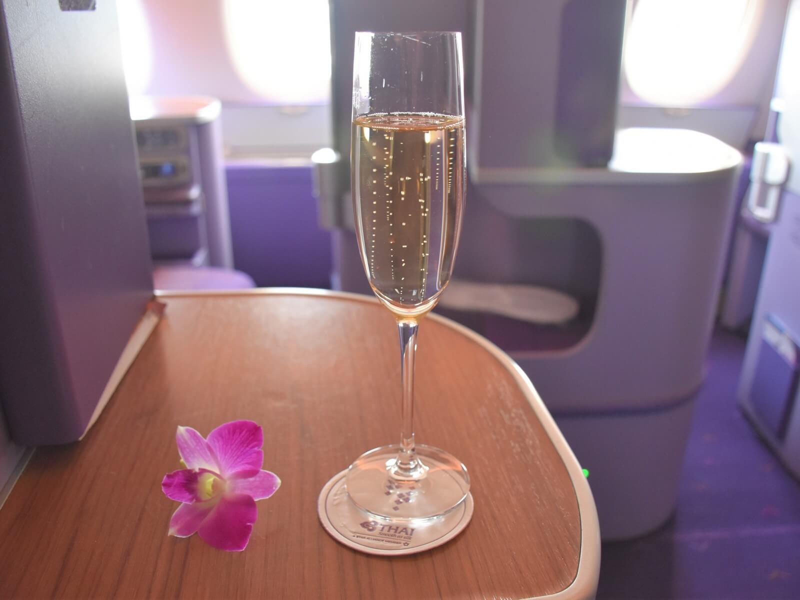 Vor dem Gate gab es zwei Schlangen: Eine für Statusinhaber, First und Business Class Passagiere, sowie eine Schlange für Economy Passagiere. Da die Lounge uns nicht begeisterte, haben wir diese etwas früher verlassen und kamen so vor allen anderen Business und First Class Gästen am Gate an. Tatsächlich war ich der erste Passagier, der das Flugzeug betrat. Wir wurden mit dem typischen thailändischen Wai begrüßt und zu unseren Sitzen begleitet. Dann erhielten wir noch eine kurze Einweisung, uns wurde das Amenity Kit gezeigt und die Kopfhörer gereicht. Kurz darauf folgte schon der Champagner und das kühle Erfrischungstuch.