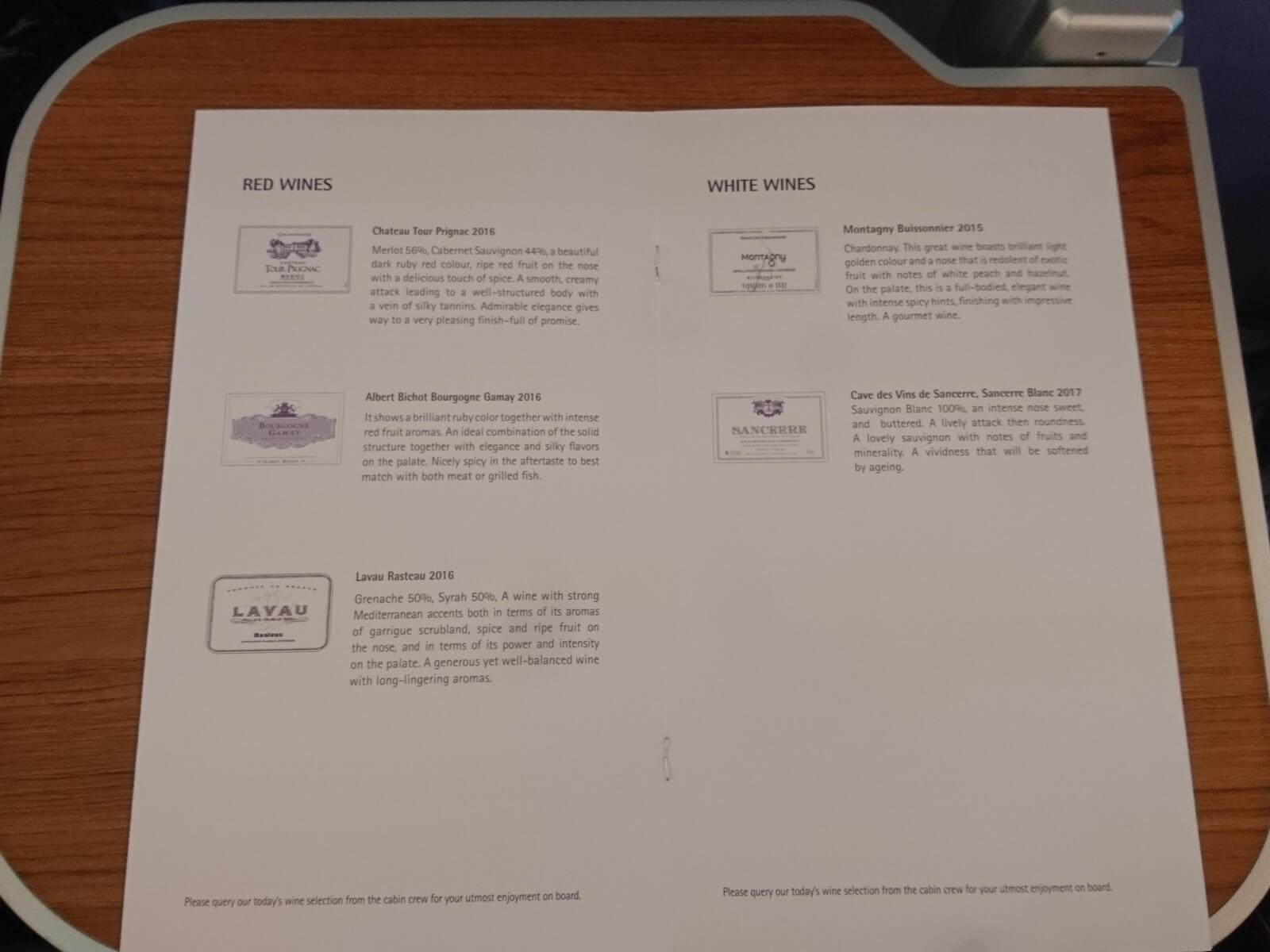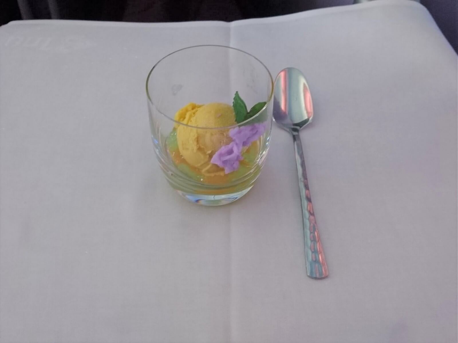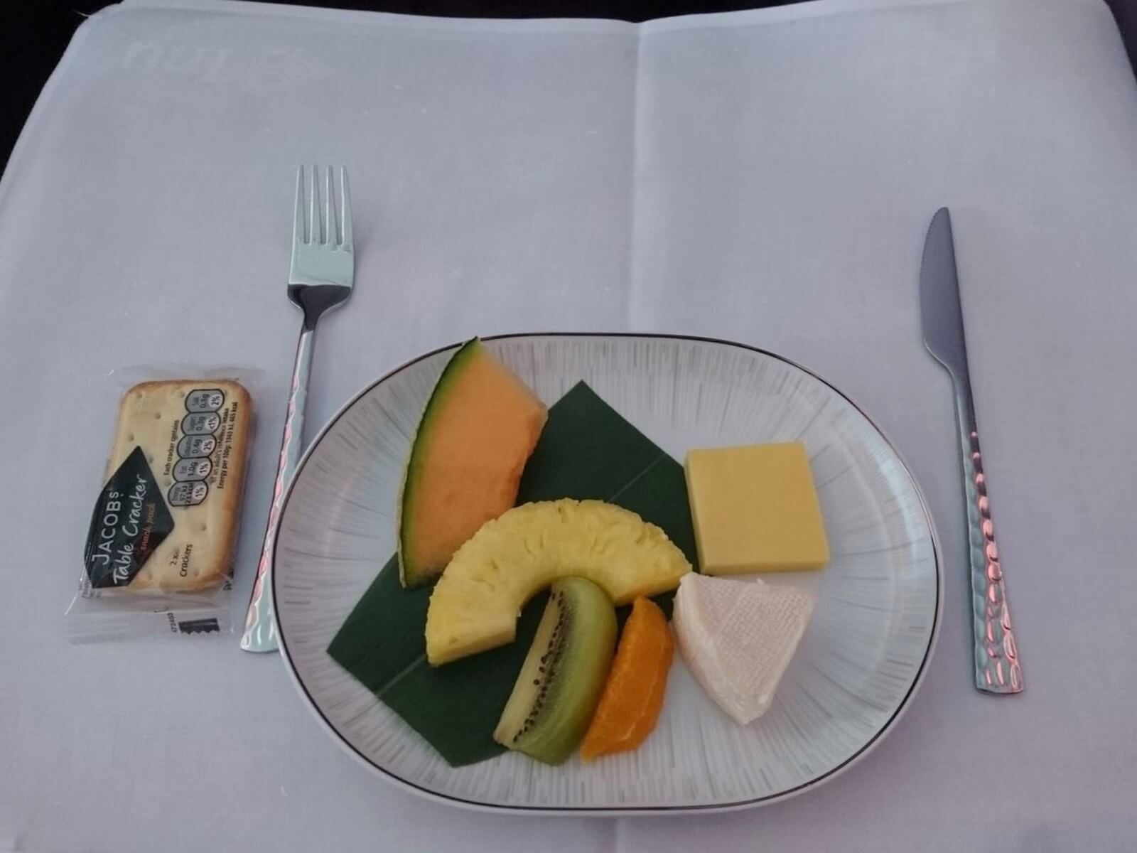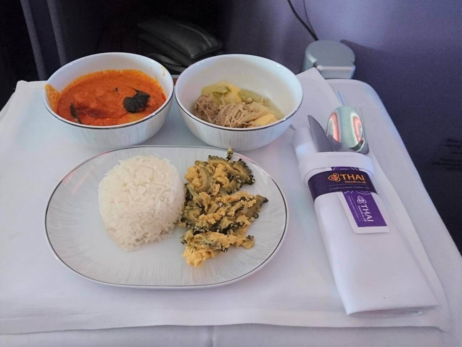 Etwa eine Stunde nach Abflug wurde uns das Essen serviert, beginnend mit der Vorspeise, bestehend aus Entenleberpastete mit Apfelkompott, Rinderpastrami und marinierten Mini-Garnelen. Dazu wählten wir ein Knoblauchbrot, was sehr gut schmeckte. Besonders stach für mich der Hauptgang heraus – das Hühnchen in rotem Thai Curry war cremig, pikant und sehr lecker! Dazu gab es eine klare Suppe mit Einlage und Gemüse und Ei sowie Jasminreis. Es folgte eine kleine Auswahl an Hart- und Weichkäse mit frischem Obst und Cracker. Den Abschluss bildete ein Mangoeis auf Pudding mit Mangosoße und kandierter Kokosnuss. Dazu wurden Tee- und Kaffeespezialitäten angeboten.