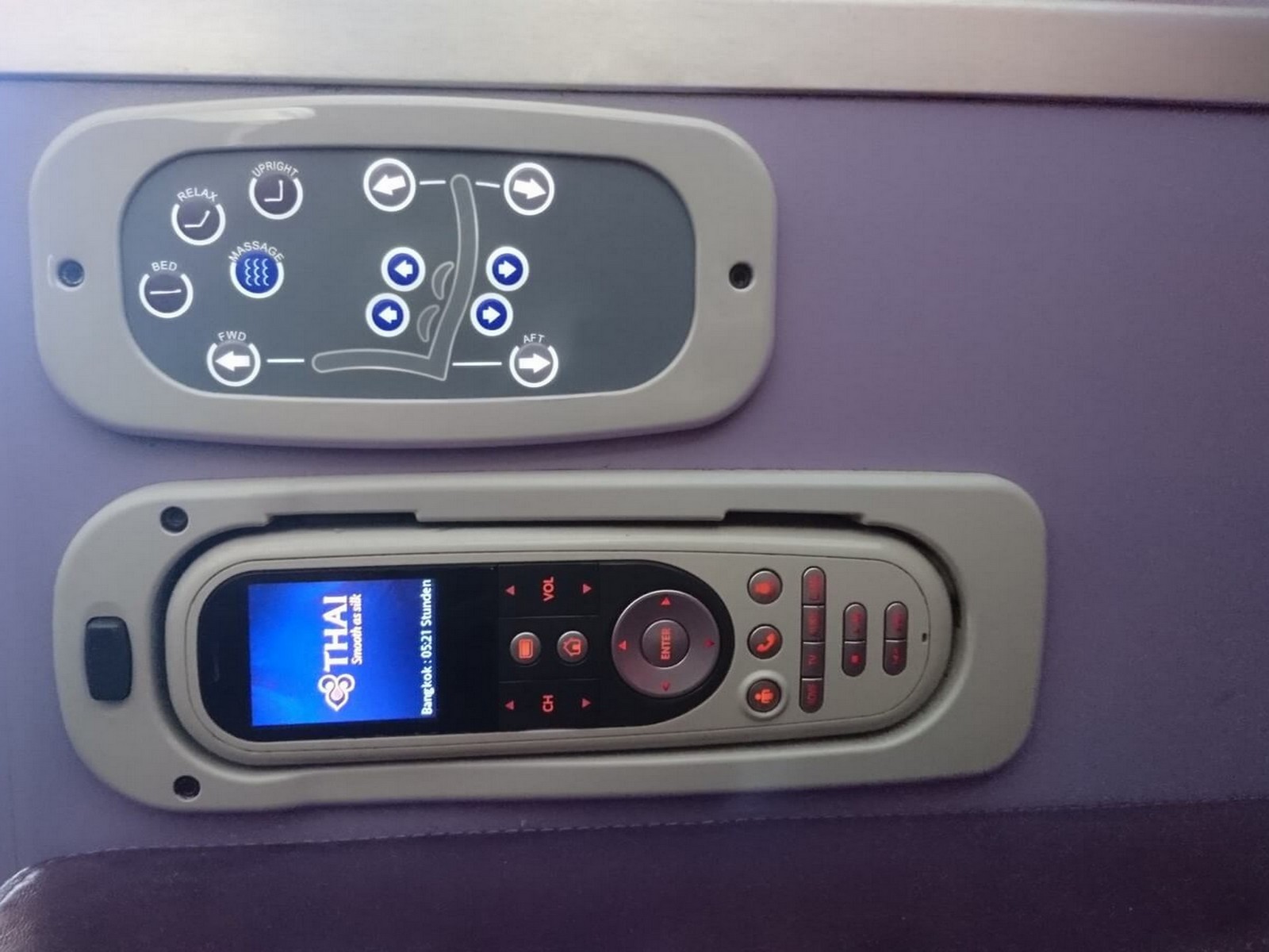 Der Business Class Sitz im A380 der Thai Airways erwartet euch mit einer Decke, einem Kissen, Slipper, einem Amenity Kit und einer Orchideenblüte. Die Orchidee und Lila prägen das Design der Kabine und der Sitze. Fast die komplette Hardware ist in lila gehalten. Jeder Sitz verfügt über eine eigene Konsole als Ablage, an der auch das Zeitschriftenfach auf Schulterhöhe und die Leselampe auf Kopfhöhe angebracht sind. An dieser Konsole ist alles Wichtige installiert. An der Innenseite unterhalb der Ablagefläche findet man die Sitzbedienung und den Controller für das Inflight Entertainment. Darunter ist eine nicht verstellbare Armlehne. Unterhalb dieser gibt es dann noch ein kleines Fach auf Hüfthöhe. Die Breite des Sitzes und die Beinfreiheit empfand ich als absolut in Ordnung. Unter der Fußablage befindet sich ein Stauraum für die Schuhe, auf die ich auch meine Laptoptasche, mein Kissen und meine Decke legen konnte. Die Kabinenhardware ist nicht mehr taufrisch, aber trotzdem nicht abgenutzt oder durchgesessen. Der Fußraum selbst ist ebenfalls sehr geräumig und auch Menschen mit großen Füssen sollten keine Probleme haben.