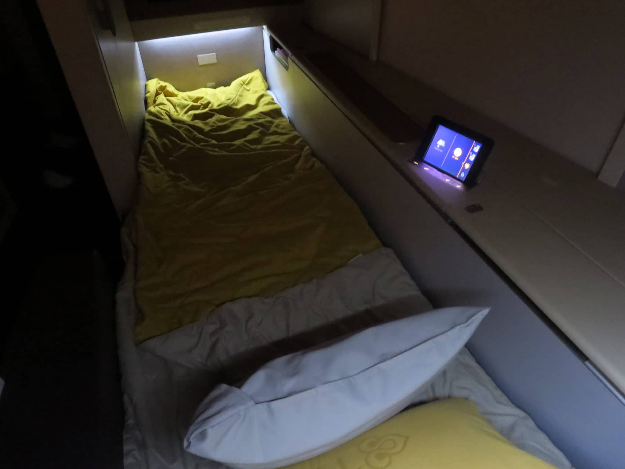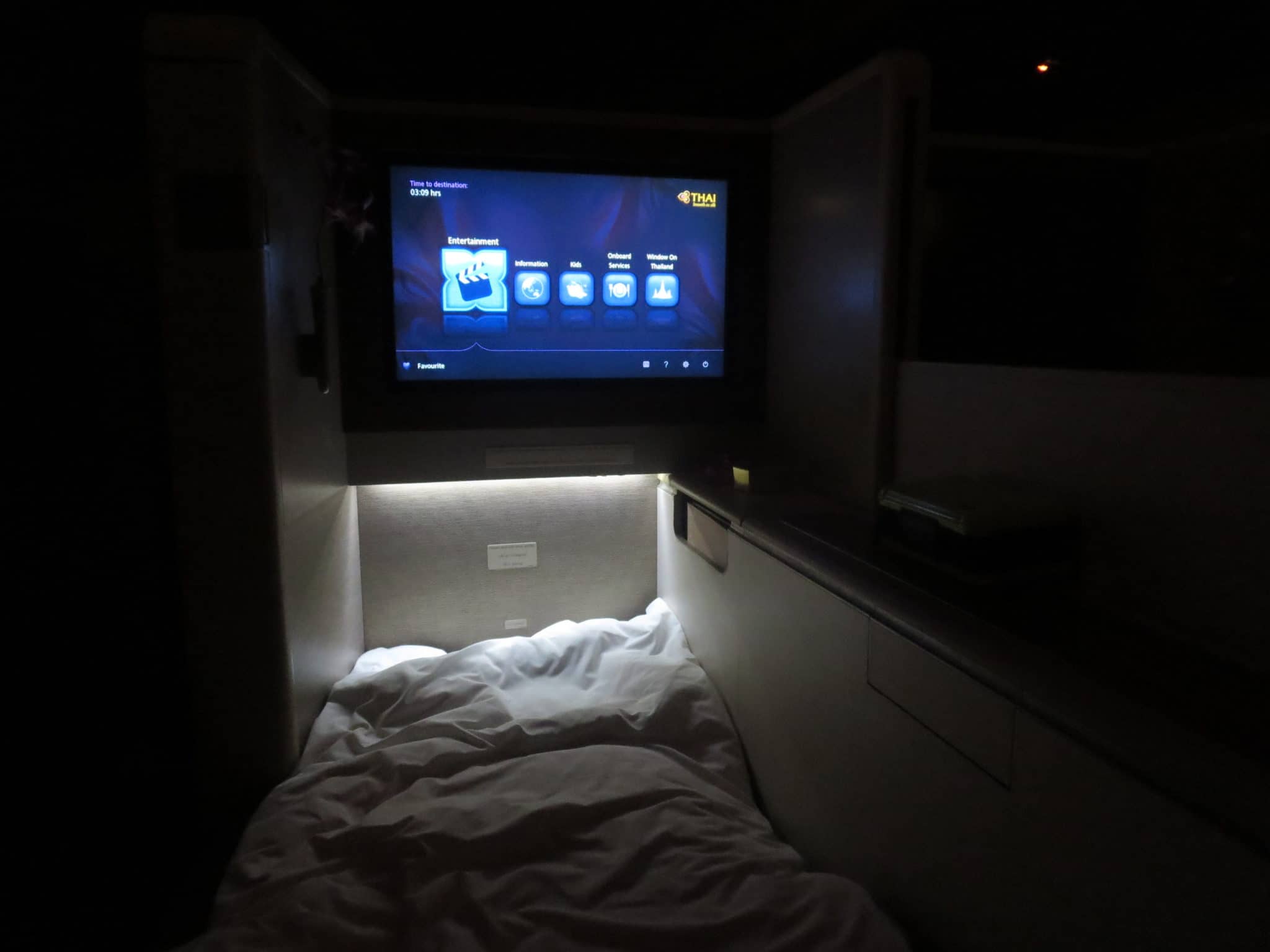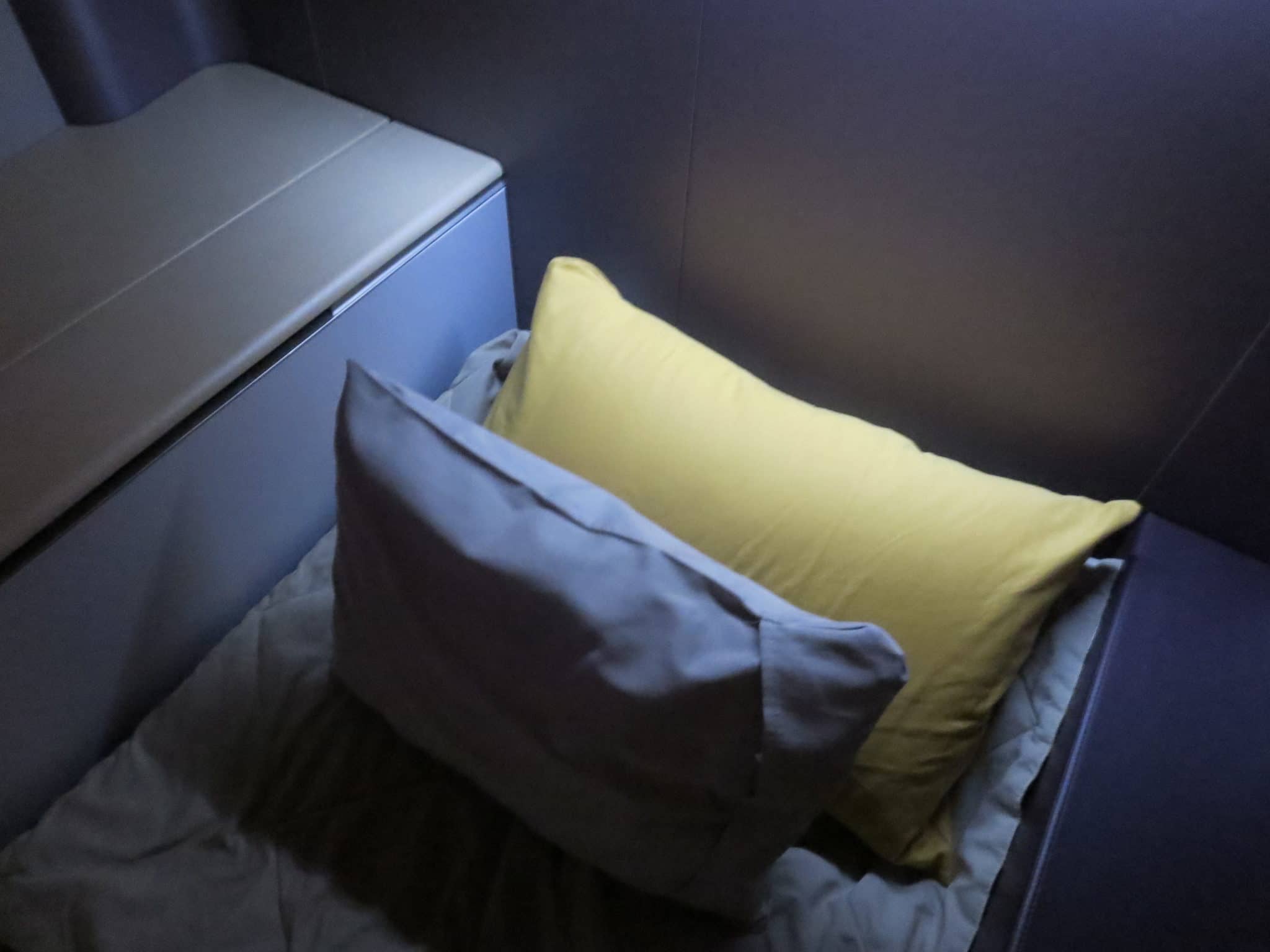 Wie bei den meisten Airlines schläft man auch bei Thai Airways auf der Sitzoberfläche, auf die von der Crew eine dünne Matratzenauflage aufgelegt wird. Insgesamt war mir das Bett aber etwas zu hart und drückte an der ein oder anderen Stelle etwas unangenehm. Das Platzangebot ist mit 221 Zentimetern Liegefläche dagegen wunderbar. Auch die zwei Kissen waren durchaus komfortabel. Gerade beim Schlafen wünsche ich mir in der Regel aber eine echte Suite, wie man sie bei anderen Airlines findet. Mit geschlossener Tür lässt es sich einfach ungestörter schlafen.