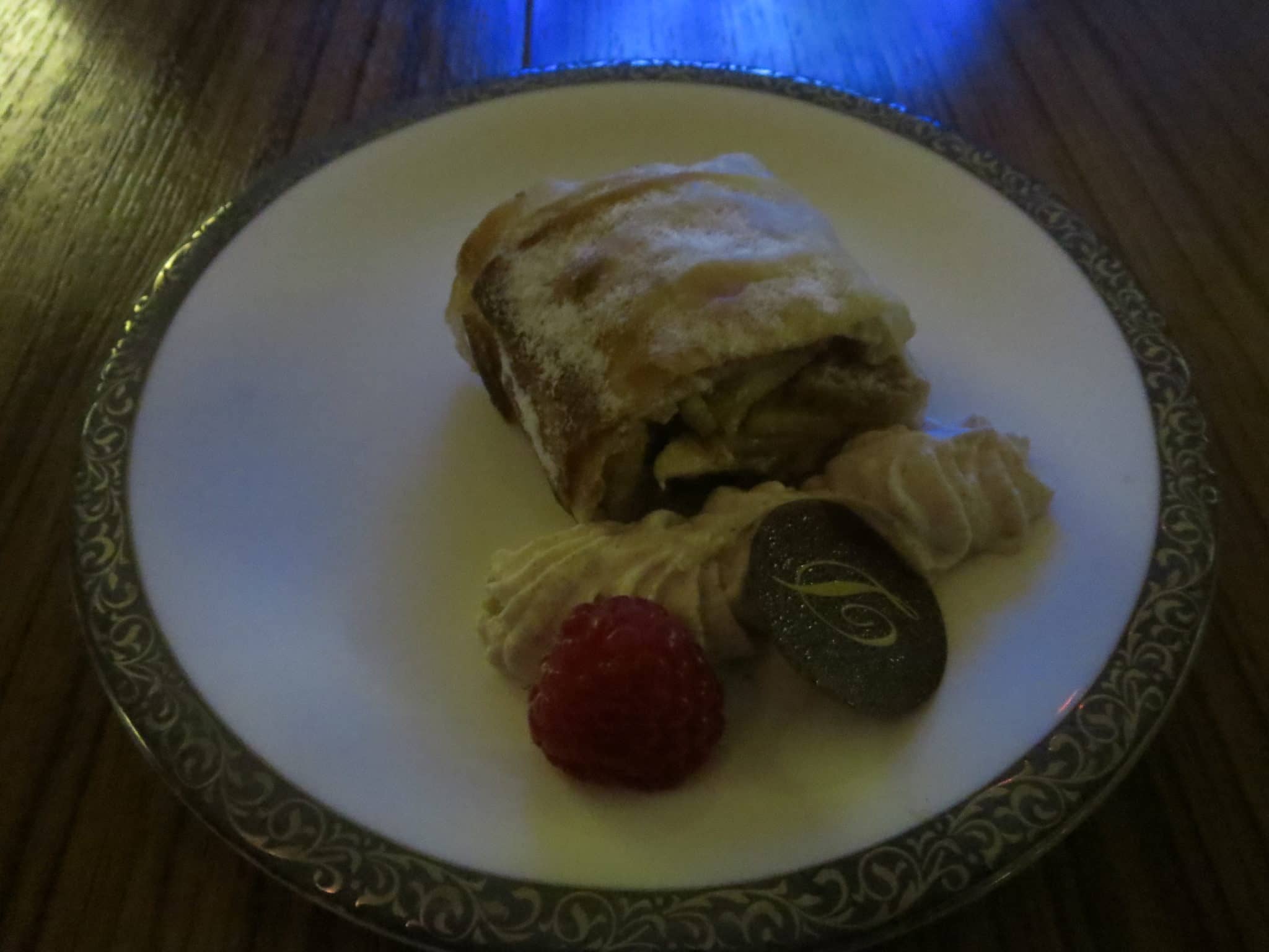 Zunächst einmal gab es allerdings Oscietra Kaviar vom Stör, welcher von Thai Airways wirklich schön hergerichtet wird, wie ihr auf den folgenden Fotos sehen könnt. Es folgte das “Thai north-eastern style grilled prok fillet and spicy pork patty” mit Chilli Fish Soße. Beim Hauptgang entschied ich mich dann für das Minced Chicken, welches sehr lecker, allerdings auch extrem scharf, war. Danach folgten schon eine kleine Käseplatte und ein paar Früchte, sowie der Wiener Apfelstrudel.