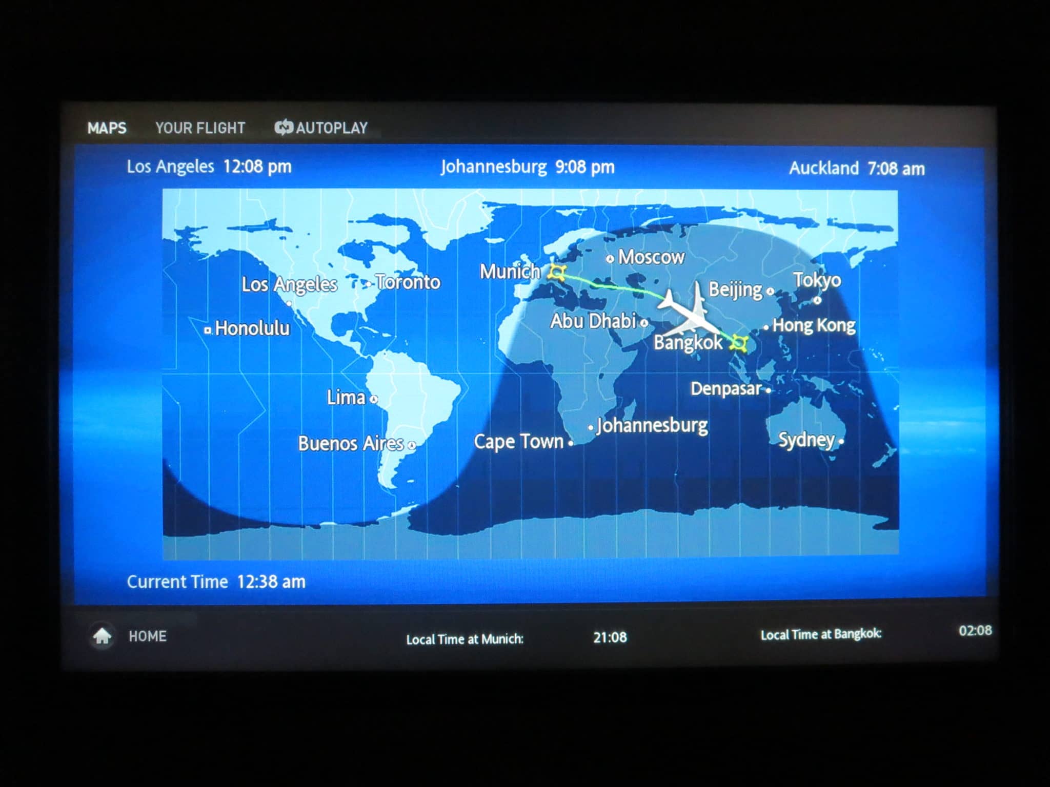 Nicht ganz zufrieden war ich mit dem Sitzkomfort des Thai Airways First Class Sitzes. Als störend empfand ich die große Abrundung des Sitzes im Kniebereich, die einem etwas das Gefühl gab vom Sitz zu rutschen. Aber das mag Geschmackssache sein und hatte sich mit geänderter Sitzeinstellung nach Erreichen der Reiseflughöhe schnell erledigt. Als deutlich störender stellte sich die Sitzaufhängung heraus. Bei Bewegung oder dem Herumrutschen auf dem Sitz bewegte sich dieser minimal und es war zu spüren, dass zwischen irgendwelchen Metallelementen in der Sitzaufhängung etwas Spiel war. Der Sitz als Ganzes konnte sich also um wenige Millimeter bewegen und klapperte dabei auch etwas. Auch bei Flugturbulenzen – von denen wir auf diesem Flug einige hatten – machte sich das bemerkbar. Entweder war das Material hier einfach ermüdet oder es muss mal eine Schraube nachgezogen werden. Etwas später stellte sich dann außerdem heraus, dass einer unserer beiden Sitze beschädigt war und sich nicht in eine flache Position bringen ließ. Mit Taschenlampe und Kopf quasi unter dem Sitz versuchte die Crew das Problem zu beheben, war aber am Ende erfolgslos. Zum Schlafen musst daher einer von uns beiden in den Sitz in der zweiten Reihe umziehen. Da der Flug glücklicherweise nicht voll ausgebucht war kein großes Problem…