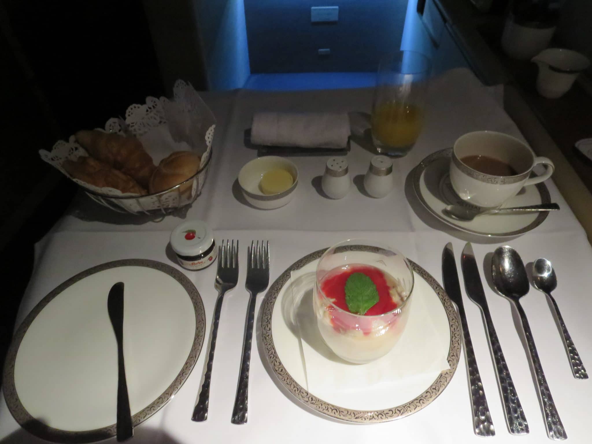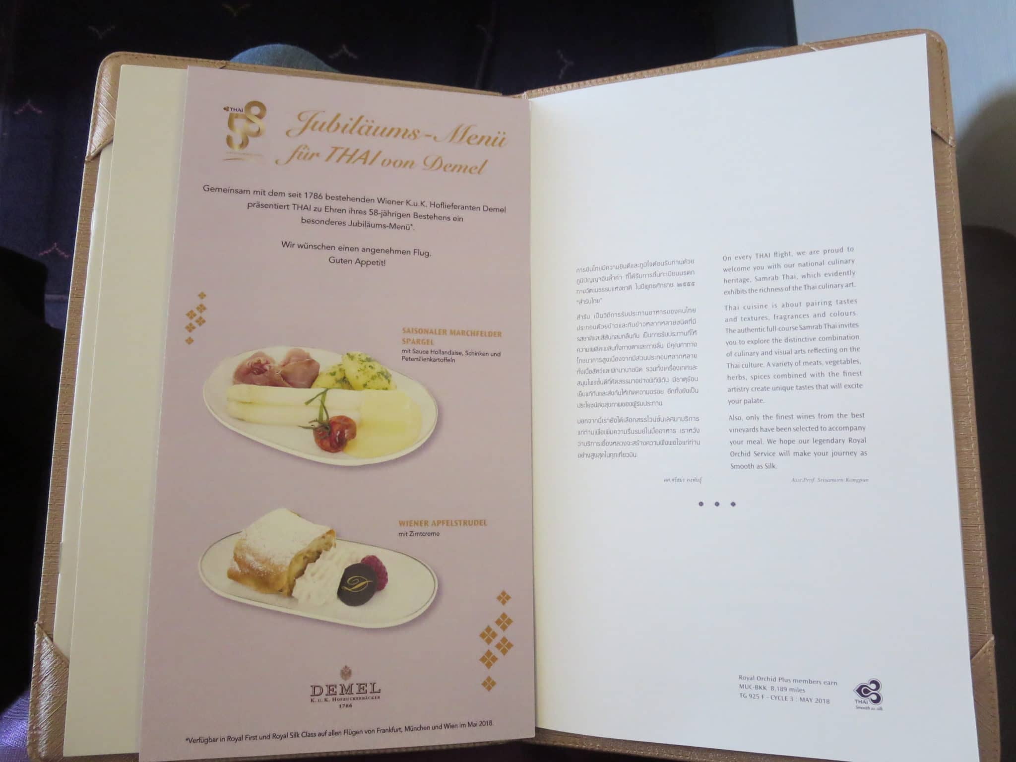 Nachdem wir bereits vor dem Start einen Dom Perignon Champagner, sowie ein Schälchen mit Nüssen serviert bekommen hatten, folgte kurze Zeit nach dem Start der richtige Essensservice. Zur Auswahl standen als Hauptgang Beef Tenderloin in Massaman Curry und Stir-fried minced chicken mit einem Thai Style Omelette. Darüberhinaus gab es ein Jubiläumsmenü mit Marchfelder Spargel. Spargel hatten wir allerdings am Tag vor der Abreise bereits in München gegessen, sodass die Wahl für uns auf ein thailändisches Gericht fiel.