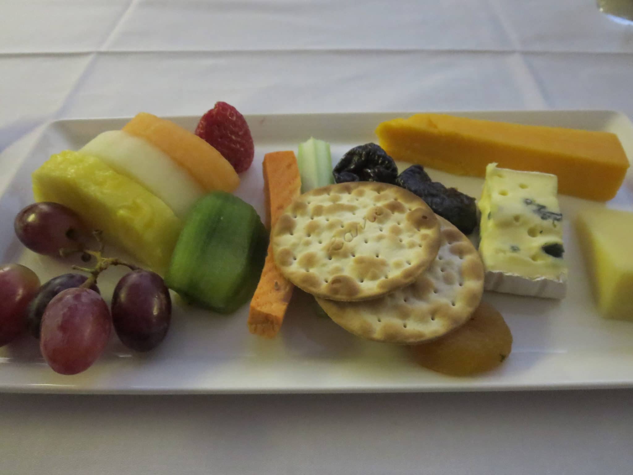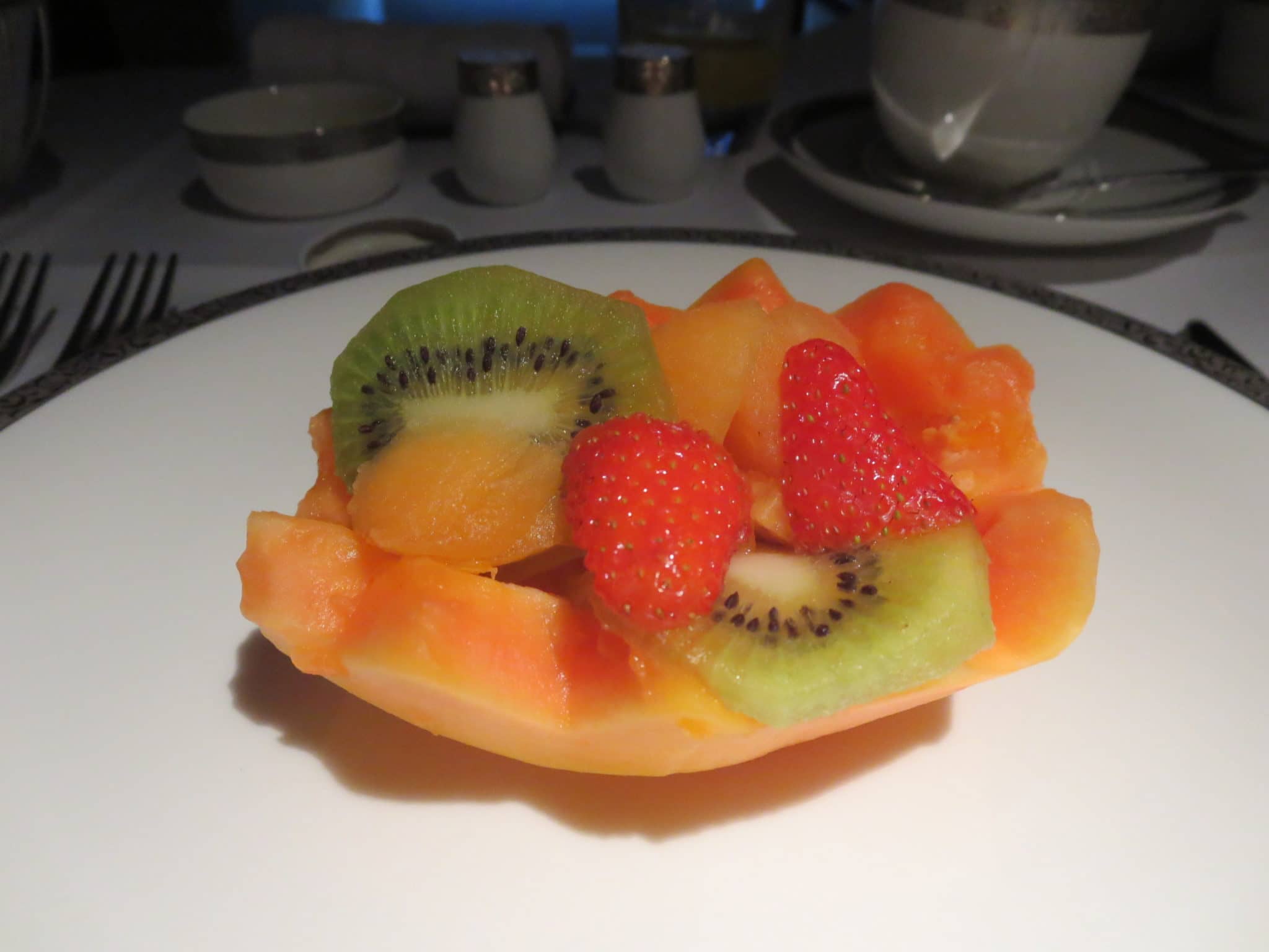 Nicht so richtig überzeugen konnte mich das Frühstück am nächsten Tag kurz vor der Landung. Da ich morgens lieber leicht esse, entschied ich mich für ein paar Früchte und etwas Müsli. Letzteres war allerdings nicht wirklich lecker und wirkte bereits etwas matschig. Schön hergerichtet waren dagegen die Früchte.
