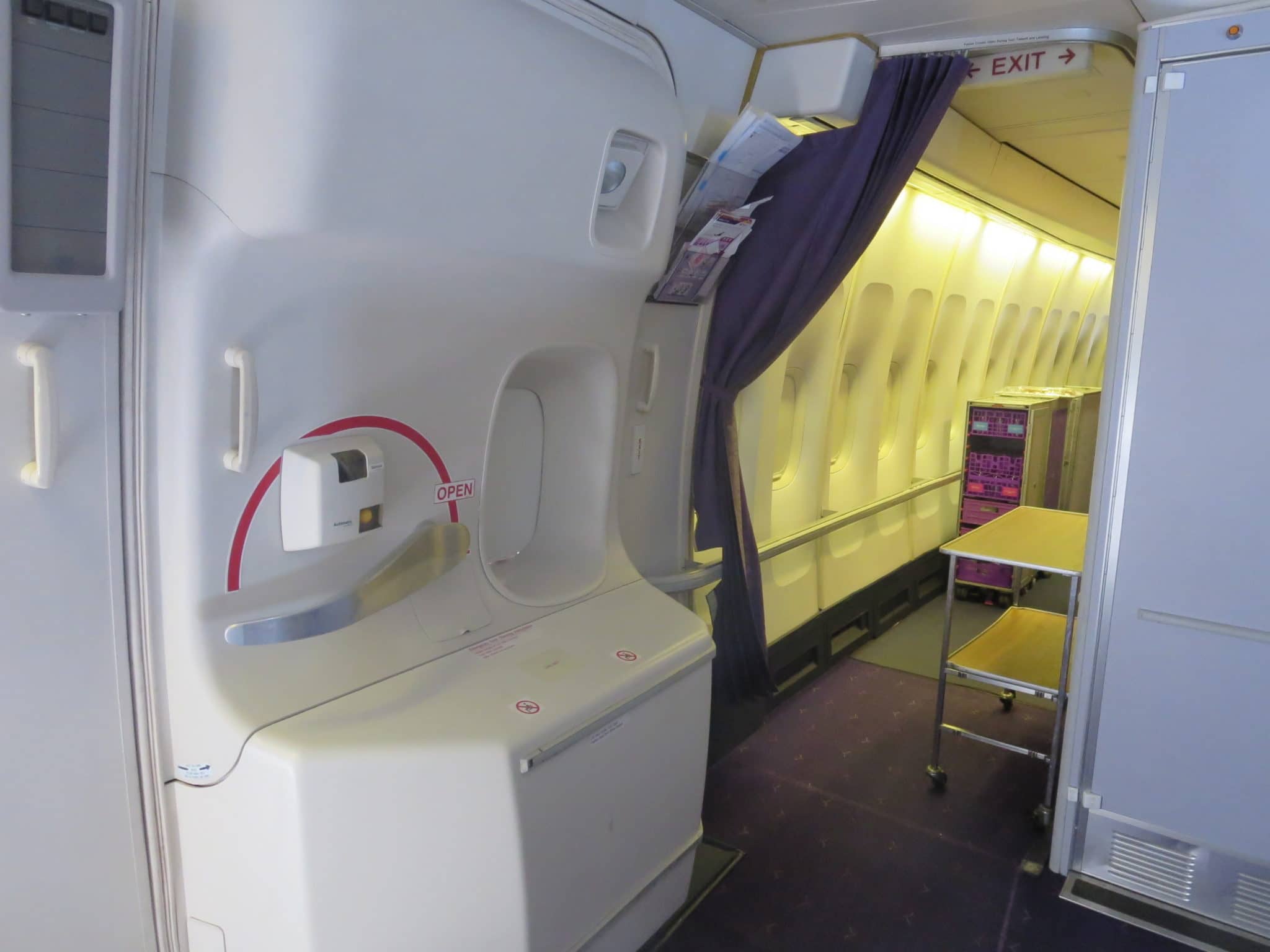 Die 9 First Class Sitze finden sich, wie nicht anders zu erwarten, im vorderen Bereich des Flugzeuges und sind in einer 1 – 2 – 1 Konfiguration angeordnet. Damit gibt es genau drei First Class Reihen. Da sich aber die Nase der Boeing 747 nach vorne verjüngt, gibt es in der zweiten Sitzreihe nur einen Mittelsitz (1 – 1 – 1), während in der Reihe dahinter zwei Passagiere in der Mitte Platz nehmen können. Diese Sitze hatten wir gewählt, da wir zu zweit reisten und die beiden Plätze in Reihe 1 bei Buchung schon belegt waren. Prinzipiell solltet ihr nämlich die Sitze in Reihe 1 bevorzugen, auch wenn ihr dann durch den Gang voneinander getrennt seid. Ganz vorne in der Nase genießt man einfach die maximale Privatsphäre. Für die Mittelsitze in Reihe 3 lässt sich das leider ganz und gar nicht behaupten. Die Sitze stehen sehr frei in der Kabine. Passagiere und Crew können sowohl an der Seite als auch hinter dem Sitz direkt an einem vorbei laufen. Zudem befinden sich die beiden WCs direkt hinter den Sitzen. Da man in Sitz 3E außerdem direkt vor der Tür sitzt, kehrt durch das Boarding der restlichen Passagiere auch erst spät Ruhe ein.