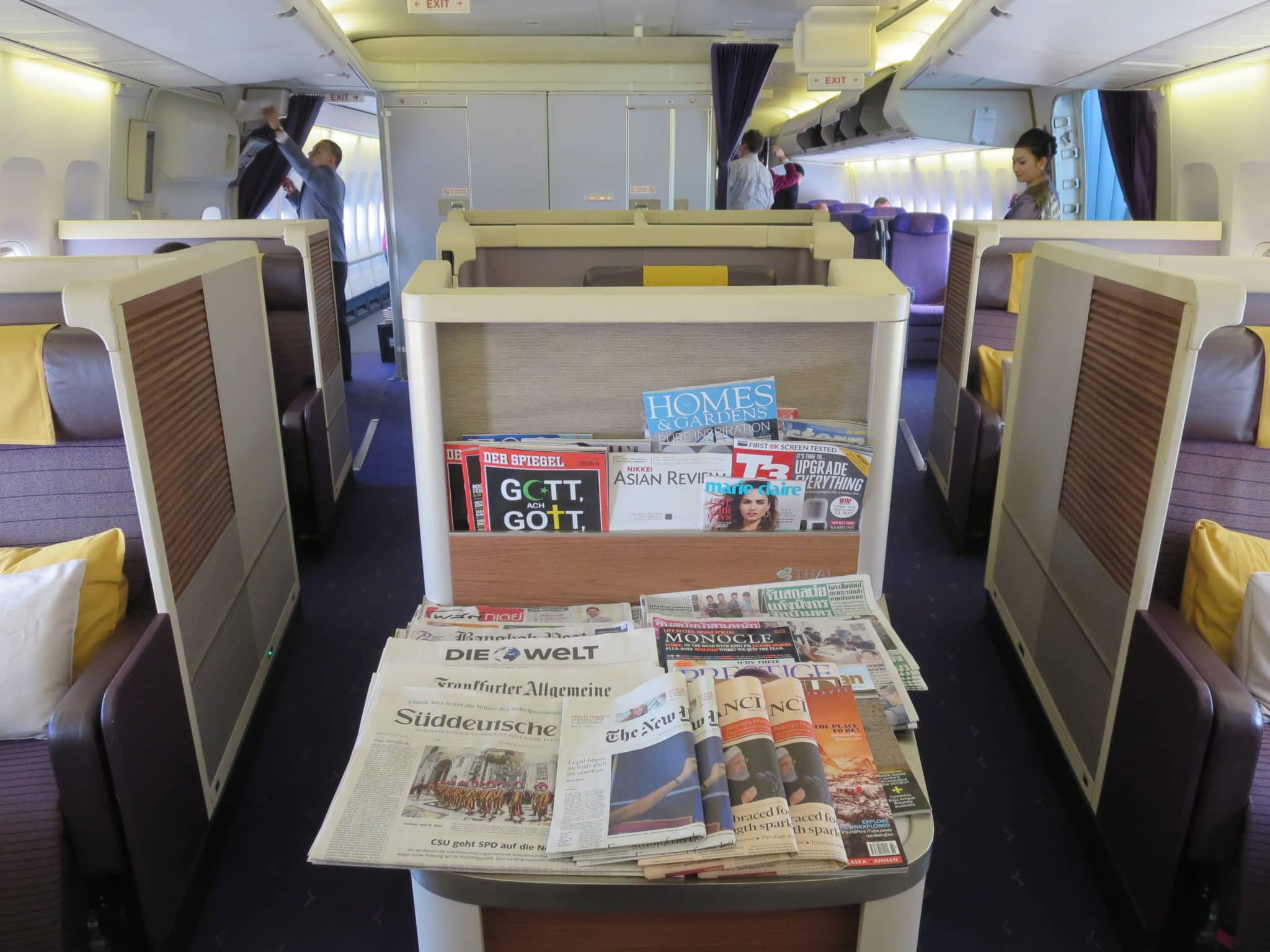 Thai Airways verfügt über insgesamt 13 Maschinen des Typs 747. Diese gibt es in drei verschiedenen Konfigurationen, sodass man an Bord entweder 10 oder 9 First Class Sitze erwarten kann. In unserem Fall handelte es sich um eine Maschine des Typs 747-400 (74N), und damit einen Flieger in der neuesten First Class Bestuhlung. Neu ist dabei relativ, die 747 von Thai Airways sind allesamt schon etwas länger im Einsatz. Deutlich neuer ist das Produkt im A380. Neben den 9 Passagieren in der Royal First Class finden auch noch 40 Business Class (Royal Silk Class) und 325 Economy Class Passagiere an Bord der Maschine Platz.