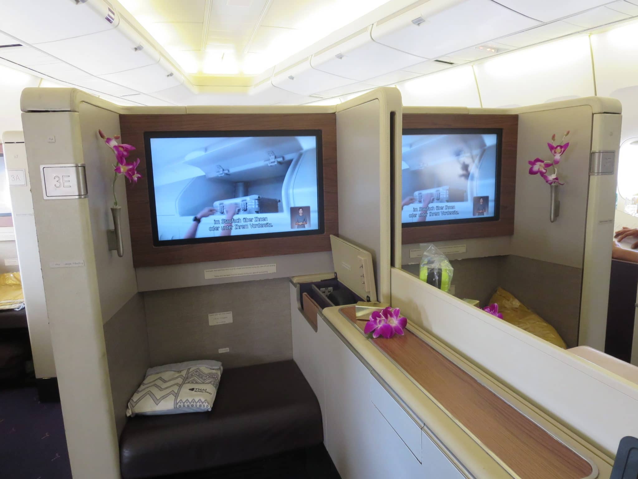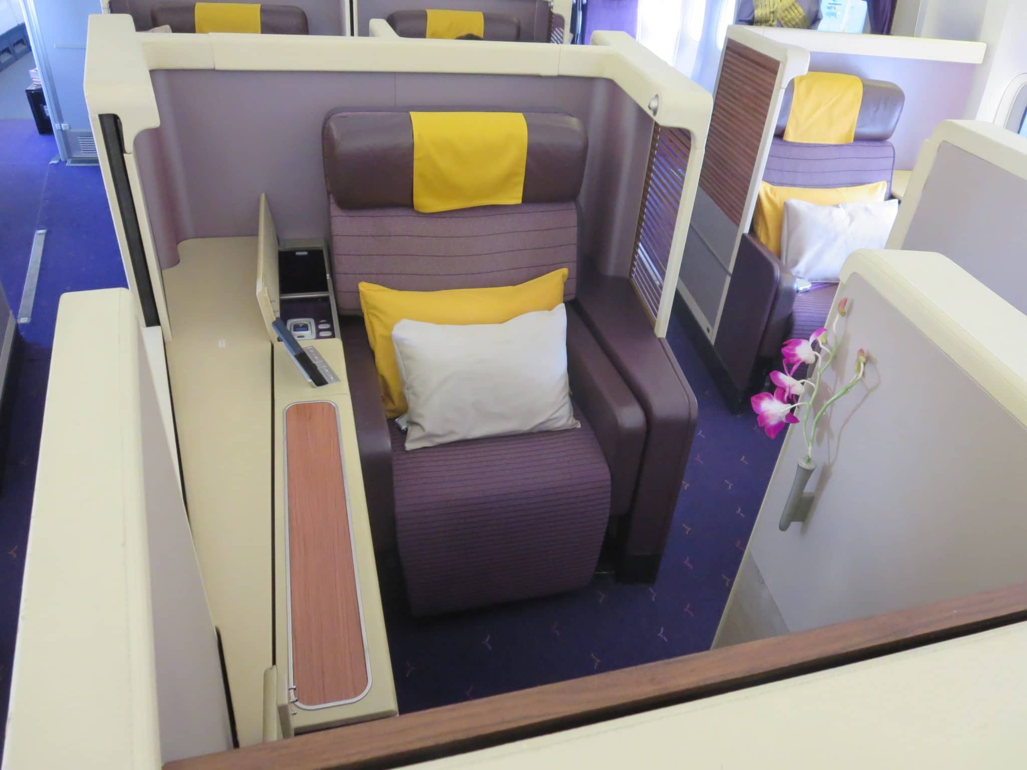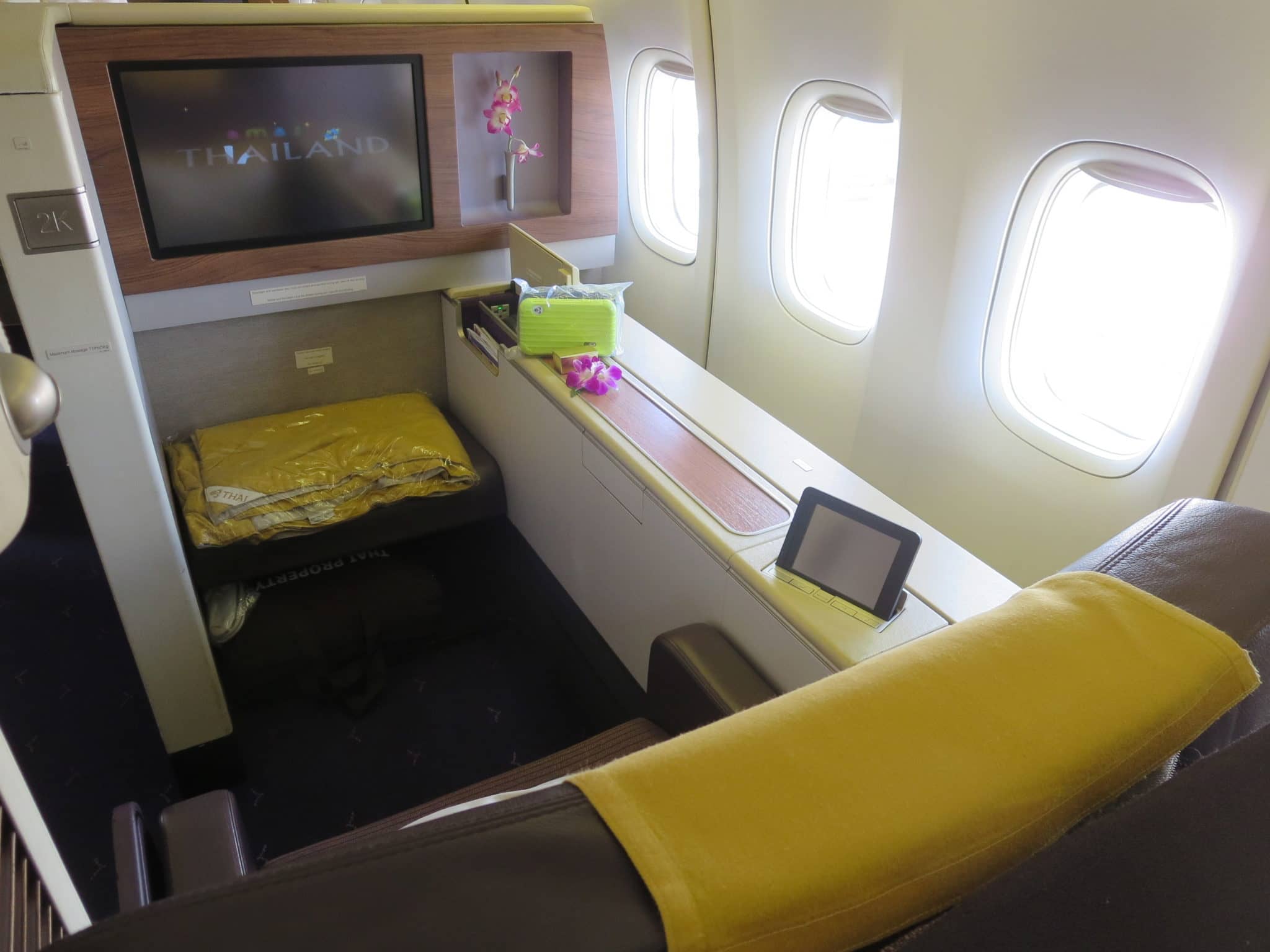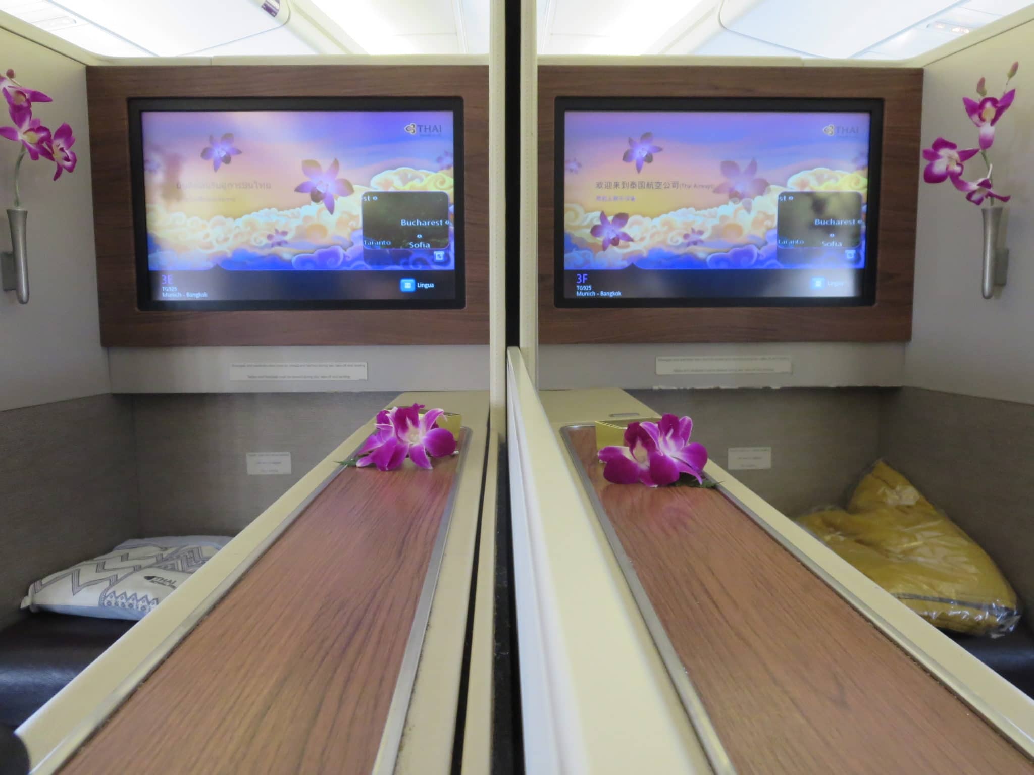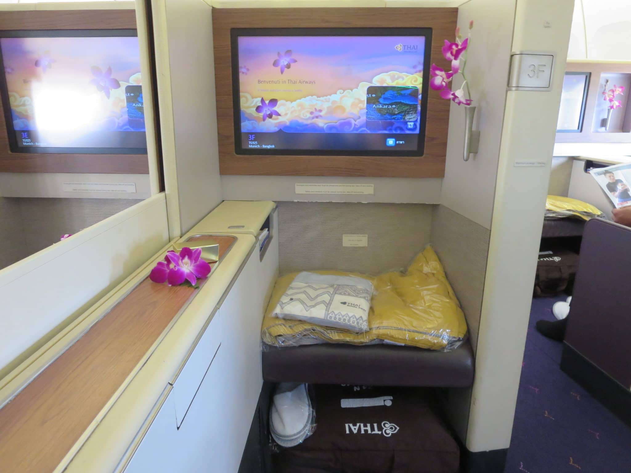 Alle 9 First Class Sitze an Bord der Thai Airways 747 sind keilförmig geschnitten, was auf die schmaler werdende Kabine in der Nase der 747 zurückzuführen ist. Bei allen Sitzen handelt es sich um fast vollständig geschlossene Suiten, die allerdings keine Türen haben. Da die Sitze in der mittleren Reihe etwas versetzt gegenüber denen am Fenster sind, ergibt sich trotzdem ein ordentliches Maß an Privatsphäre. Wer allein reist und auf Sitz 3E oder 3F enden sollte, fährt einfach die Trennwand in der Mitte hoch.