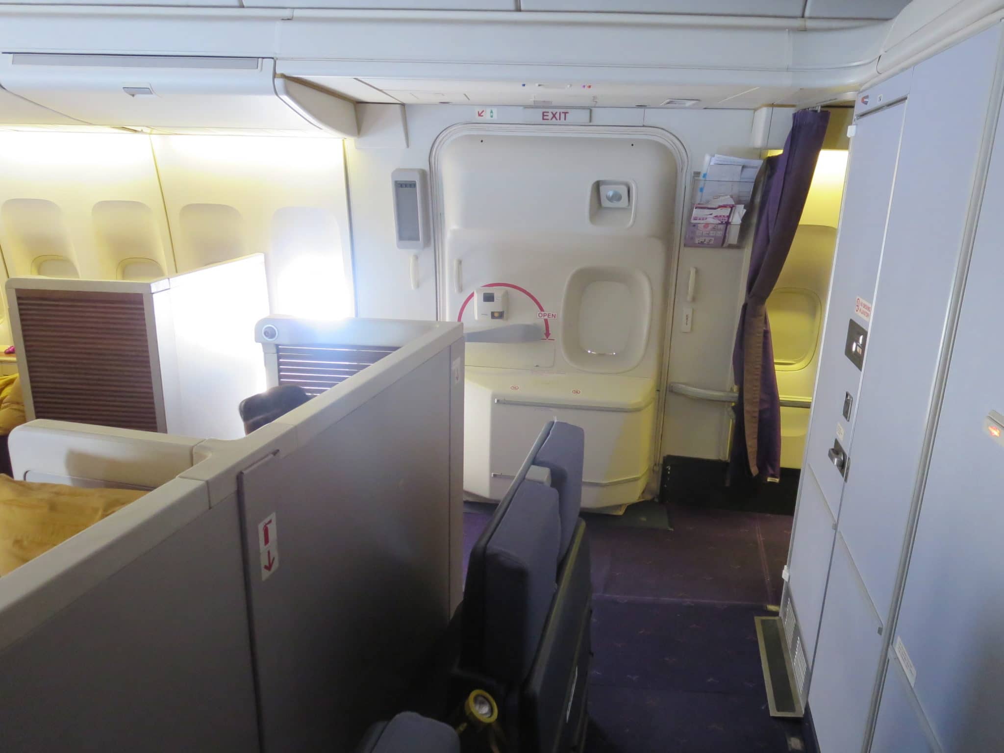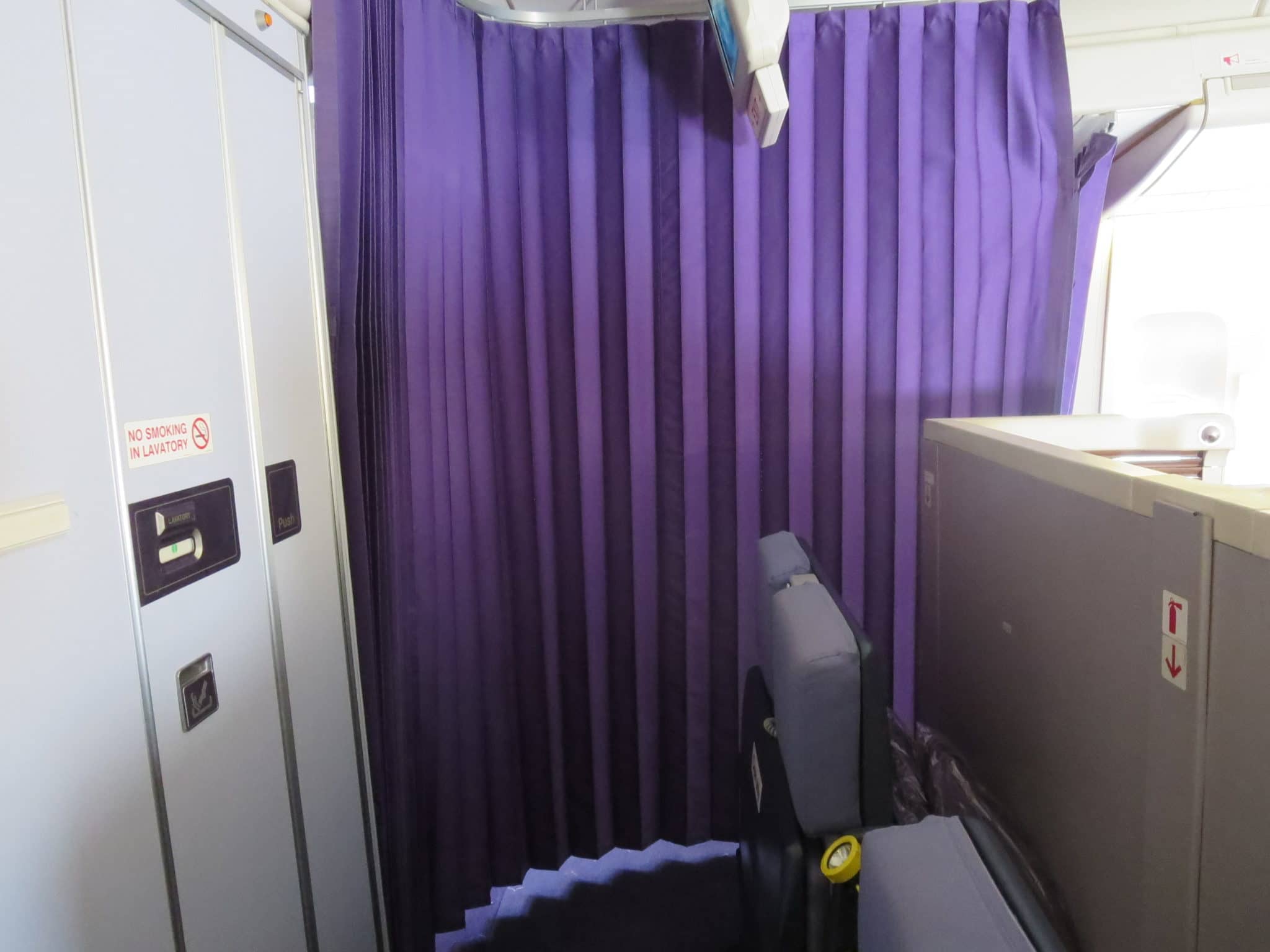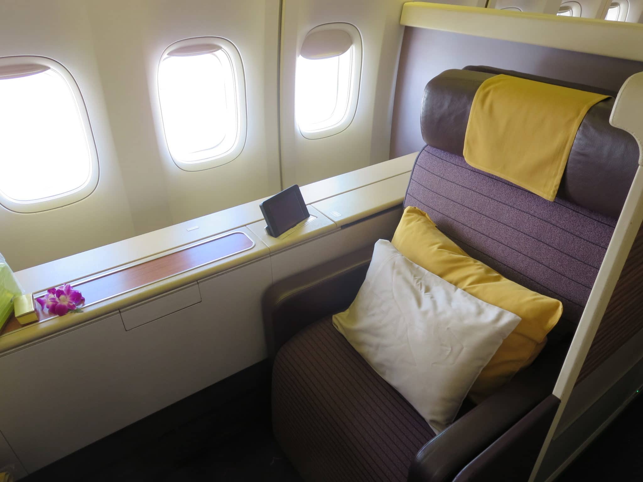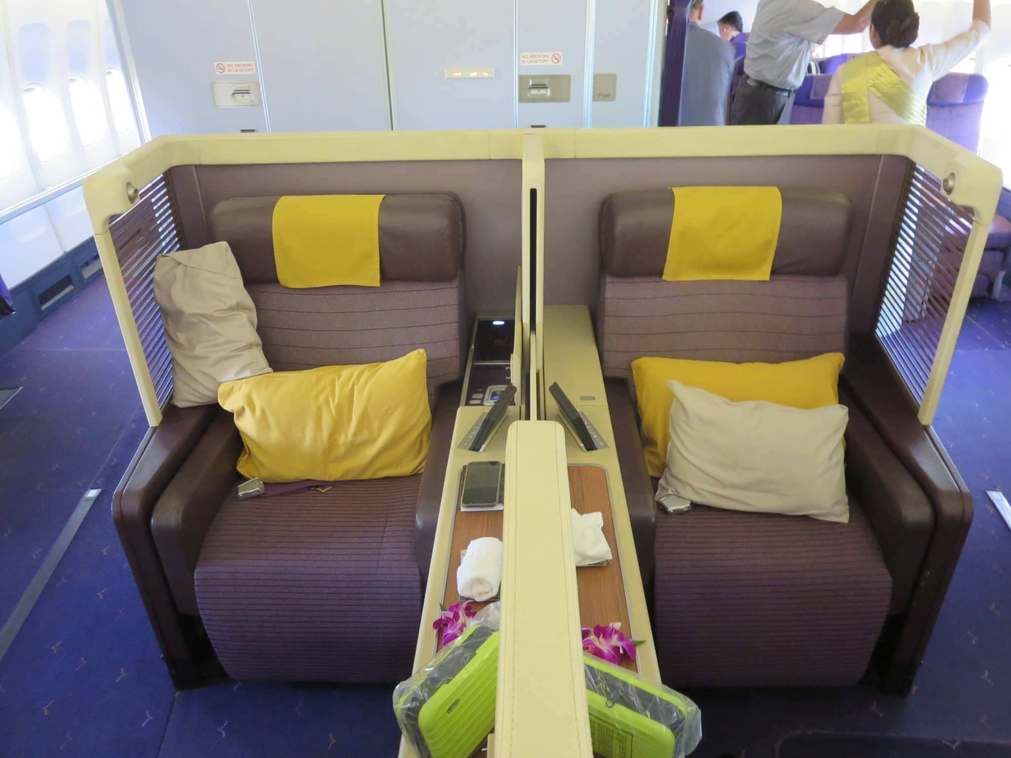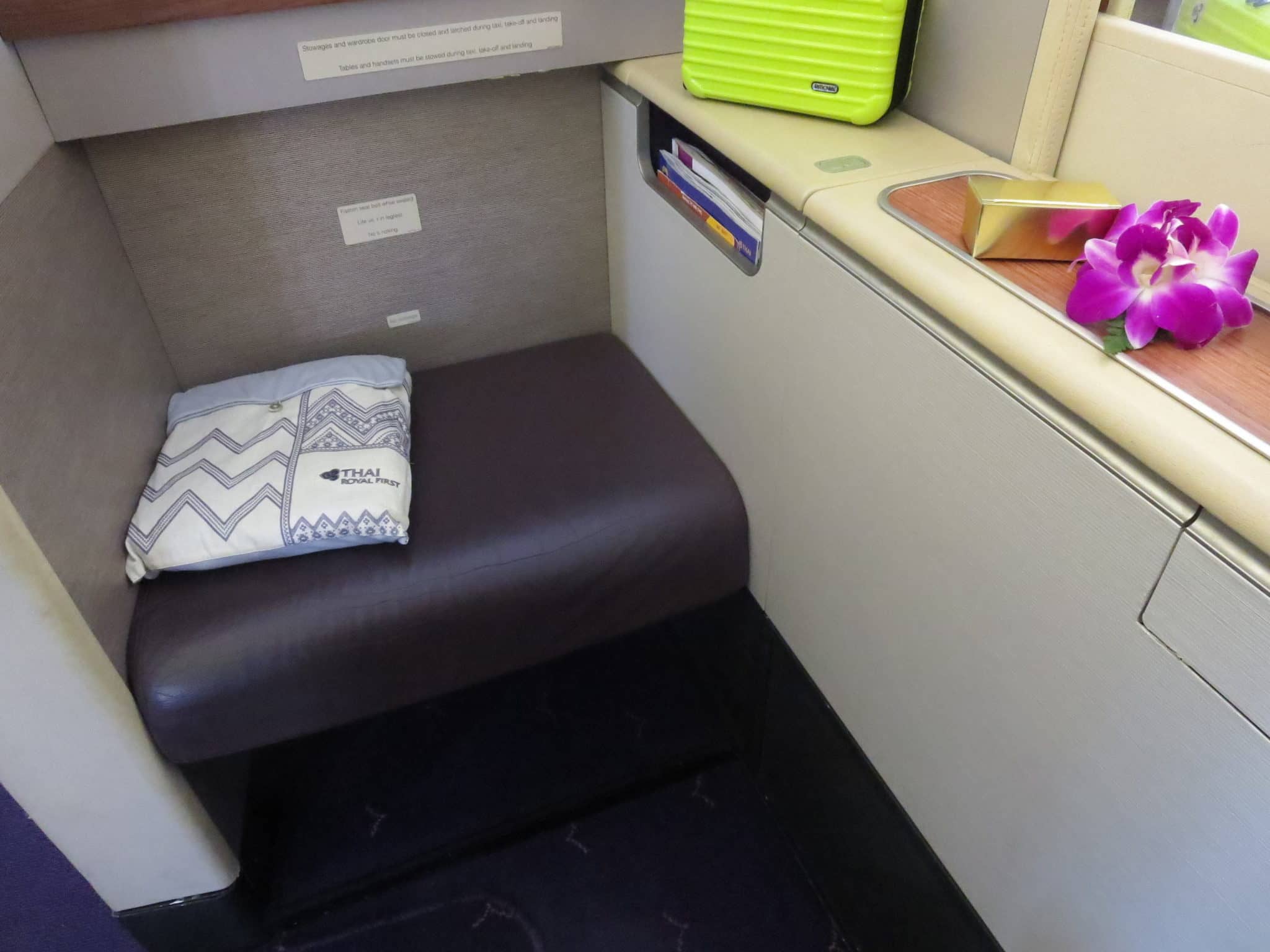 Alle 9 First Class Sitze an Bord der Thai Airways 747 sind keilförmig geschnitten, was auf die schmaler werdende Kabine in der Nase der 747 zurückzuführen ist. Bei allen Sitzen handelt es sich um fast vollständig geschlossene Suiten, die allerdings keine Türen haben. Da die Sitze in der mittleren Reihe etwas versetzt gegenüber denen am Fenster sind, ergibt sich trotzdem ein ordentliches Maß an Privatsphäre. Wer allein reist und auf Sitz 3E oder 3F enden sollte, fährt einfach die Trennwand in der Mitte hoch.