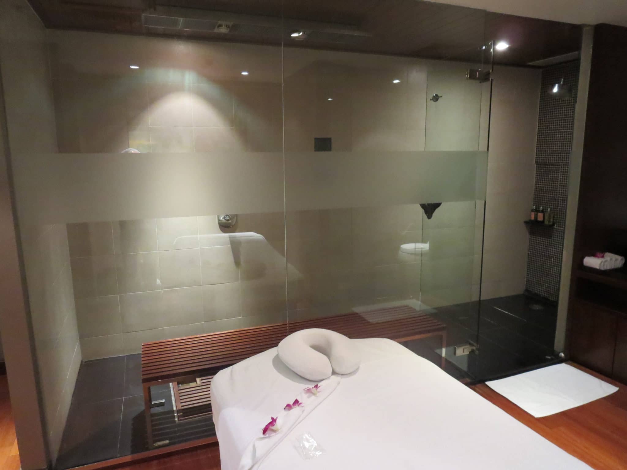 Nach einigen Stunden in der Hitze Thailands und dem Gewusel auf den Straßen Bangkoks freuten wir uns umso mehr auf die Massage. Als es dann soweit war, begleitete uns eine der Lounge-Mitarbeiter hinüber zum Spa, welches sich gegenüber der eigentlichen First Class Lounge befindet. Das Spa ist 667 Quadratmeter groß und damit deutlich mehr als nur ein, zwei kleine Massageräume, wie man sie aus anderen Lounges kennen mag. Neben 3 Suiten für Ganzkörpermassagen, gibt es noch 6 Behandlungsecken für Nacken- und Schultermassagen, sowie 2 Dampfräume, zwei Saunaräume und 4 Duschräume. Hinzu kommt ein kleiner Loungebereich in dem heiße und kalte Getränke serviert werden. Es handelt sich also um ein vollwertiges Spa, wie es auch abseits ein Flughafens zu finden sein könnte.