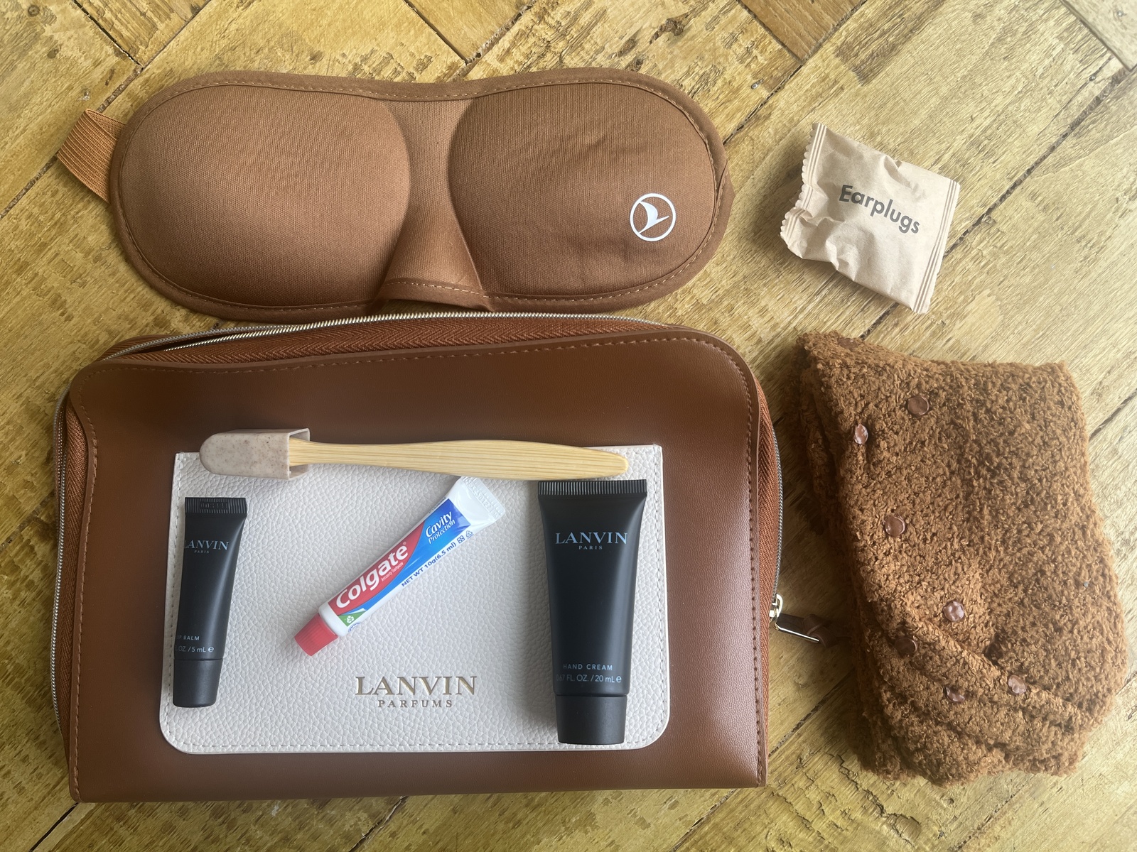 Das Amenity Kit gab es in zwei Varianten: Das braun-weiße oder schwarz-braune Lederetui beinhaltete eine Schlafmaske, Ohrstöpsel, Socken, Zahnbürste, Zahnpasta, Lippenbalsam und Handcreme. Das Etui ist sehr hochwertig und lässt sich gut als kleiner Kulturbeutel wiederverwenden. Zusätzlich lagen am Platz Slipper und eine Decke bereit. Eine Matratzenauflage wurde auf Wunsch von der Crew gebracht.
