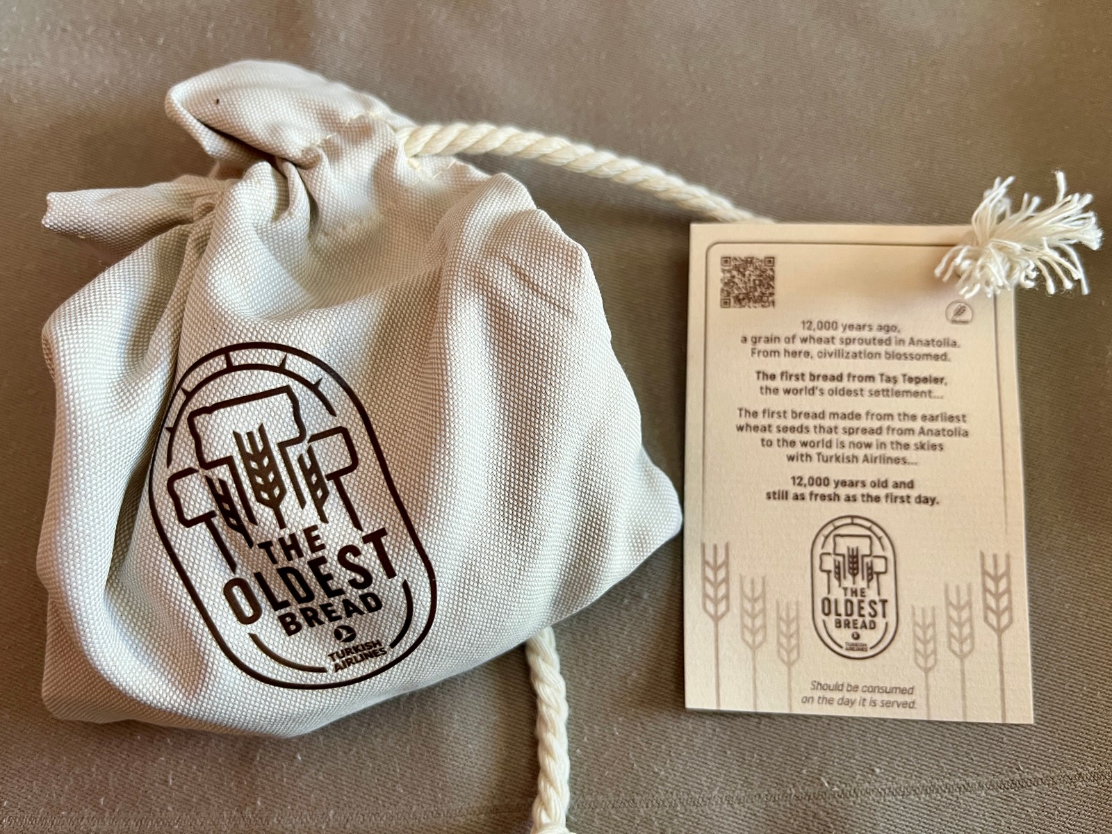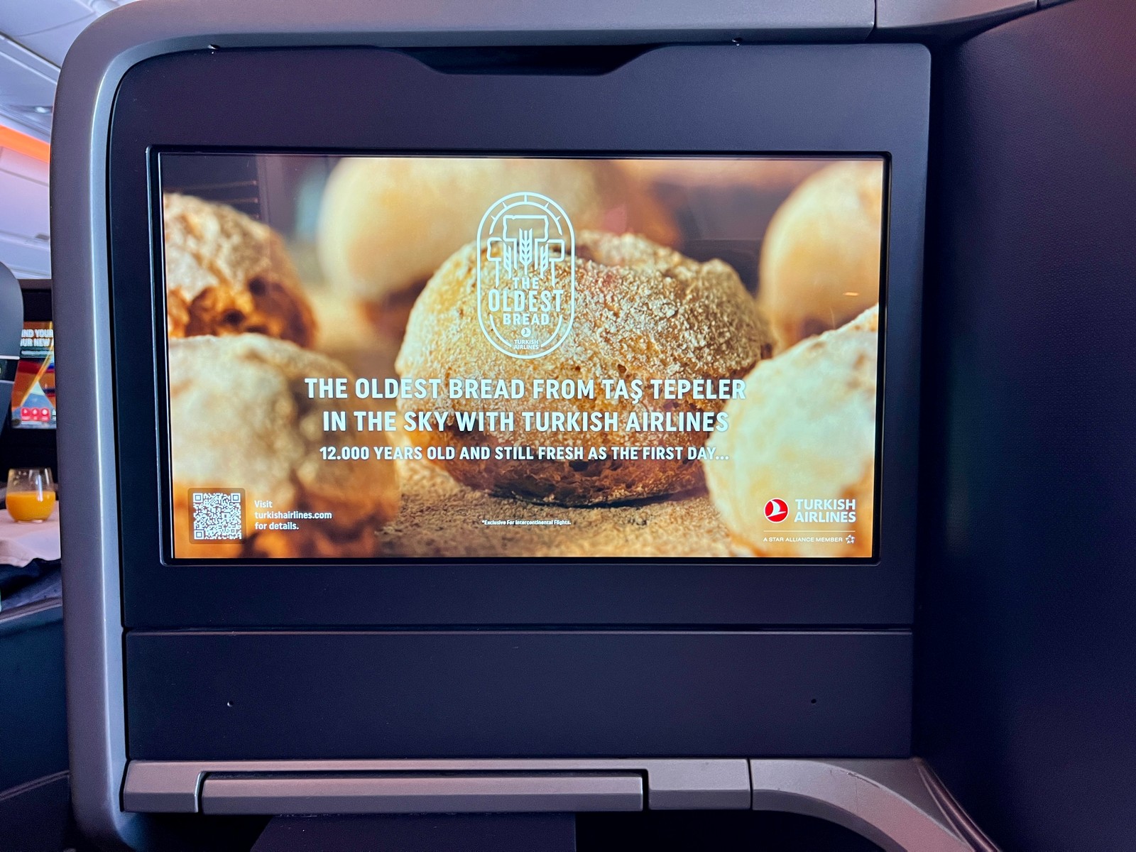 Zudem wirbt Turkish Airlines sehr offensiv mit ihrem “humanity’s oldest bread”. Werbespots im Entertainment-System machen einem das Brot mit seiner 12.000 Jahre alten anatolischen Geschichte früh schmackhaft. Überreicht wird es dann in einem kleinen Stoffbeutel. Die gesamte Entstehungsgeschichte lässt sich hier auf der Turkish Airlines Webseite einsehen. Tatsächlich hat mir das Brot sehr gut geschmeckt.
