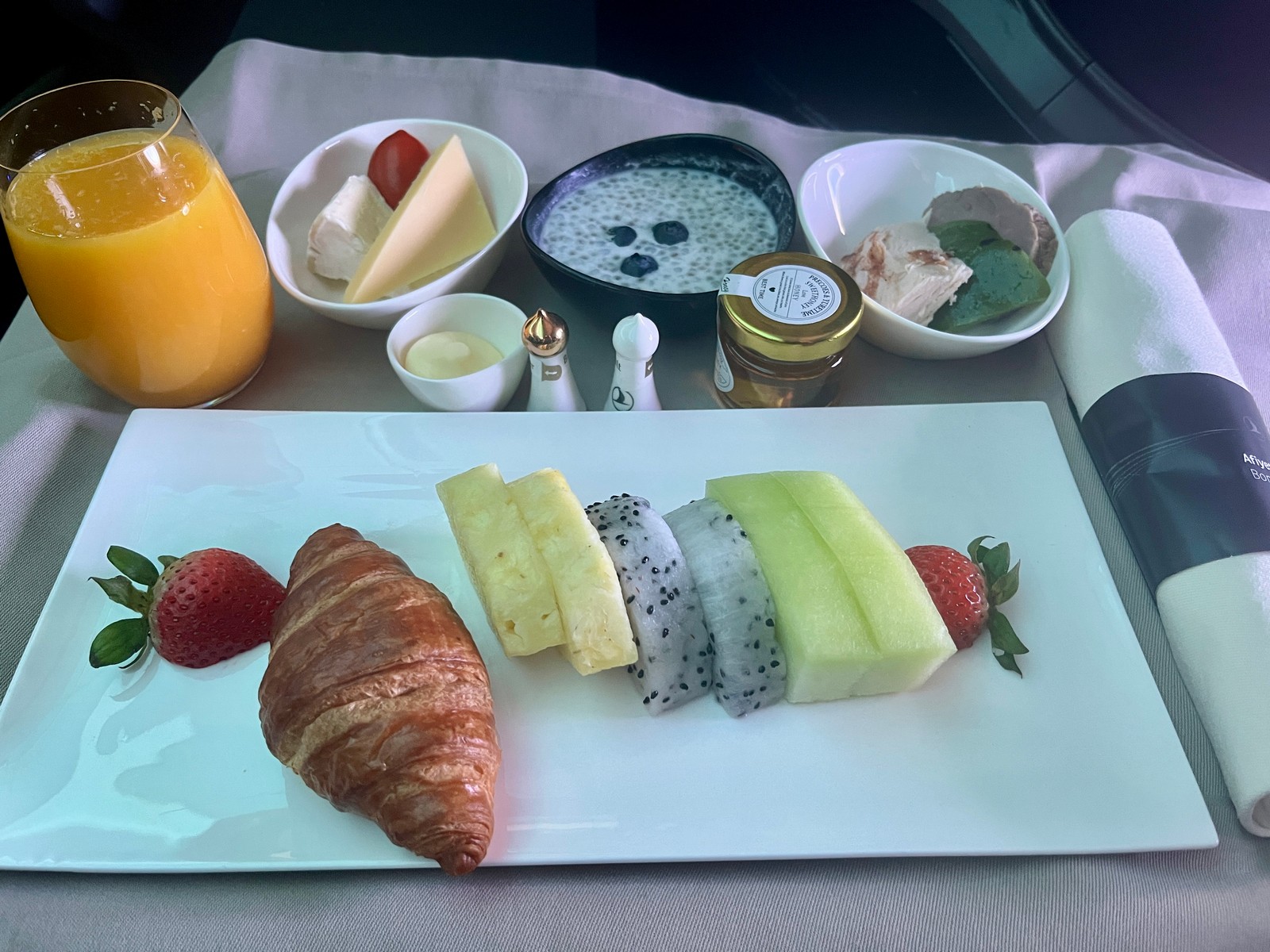 In der Praxis wurde dieses sehr hohe Niveau nicht vollständig erreicht. Zunächst einmal dauerte es etwa 25 Minuten bis der Service in Form eines kalten Tuches und eines Willkommensgetränks (zur Auswahl standen Champagner, Saft und Wasser) begann. Im Weiteren schaute dann kurz vor dem Start der fliegende Koch vorbei, dessen Rolle sich aber auf die Frage, welcher Hauptgang gewünscht sei, beschränkte. Es wurde weder auf den im Menü beworbenen “Dine on Demand” Service hingewiesen noch andere individuelle Wünsche erfragt. Das Menü sah auf unserem Flug von Hongkong nach Istanbul wie folgt aus: