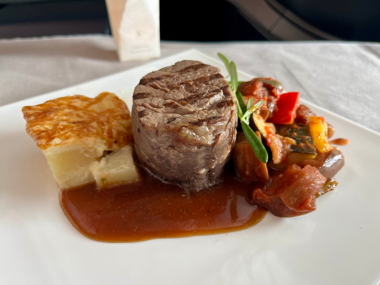 - Fillet of beef – Ratatouille, potato gratin, demi glace sauce