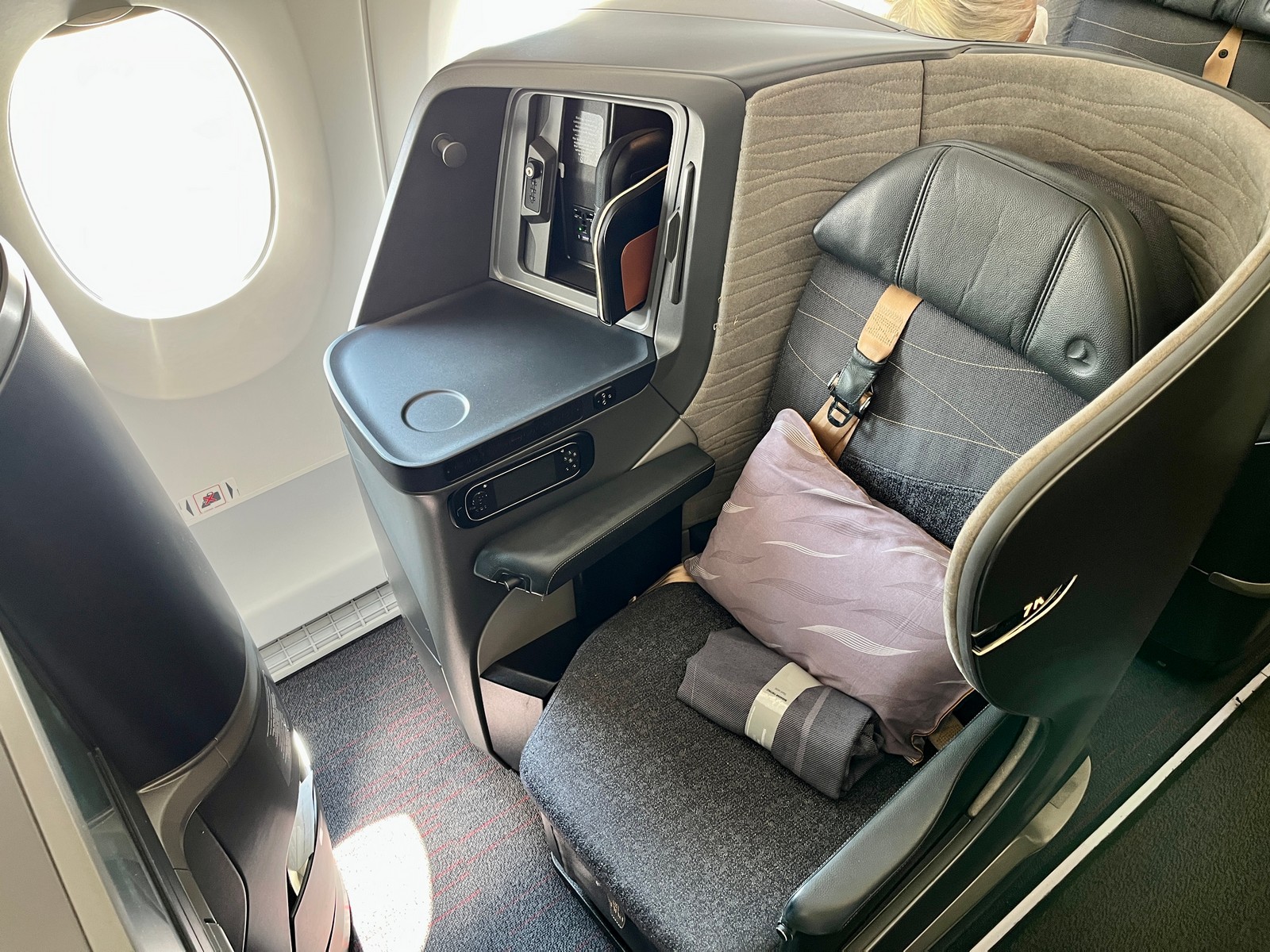 Da es sich bei unserem Flug um einen Tagflug handelte, habe ich nicht geschlafen und kann daher keine Aussage zum Schlafkomfort machen. Dank von der Crew ausgeteilter Matratzenauflage, der geraden Liegefläche und Ausrichtung sowie der guten Abschirmung des Sitzes dürfte der Sitz dennoch einen hohen Schlafkomfort bieten.