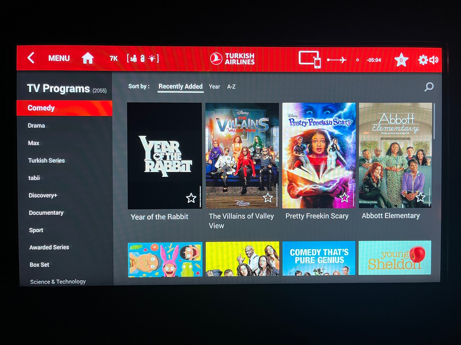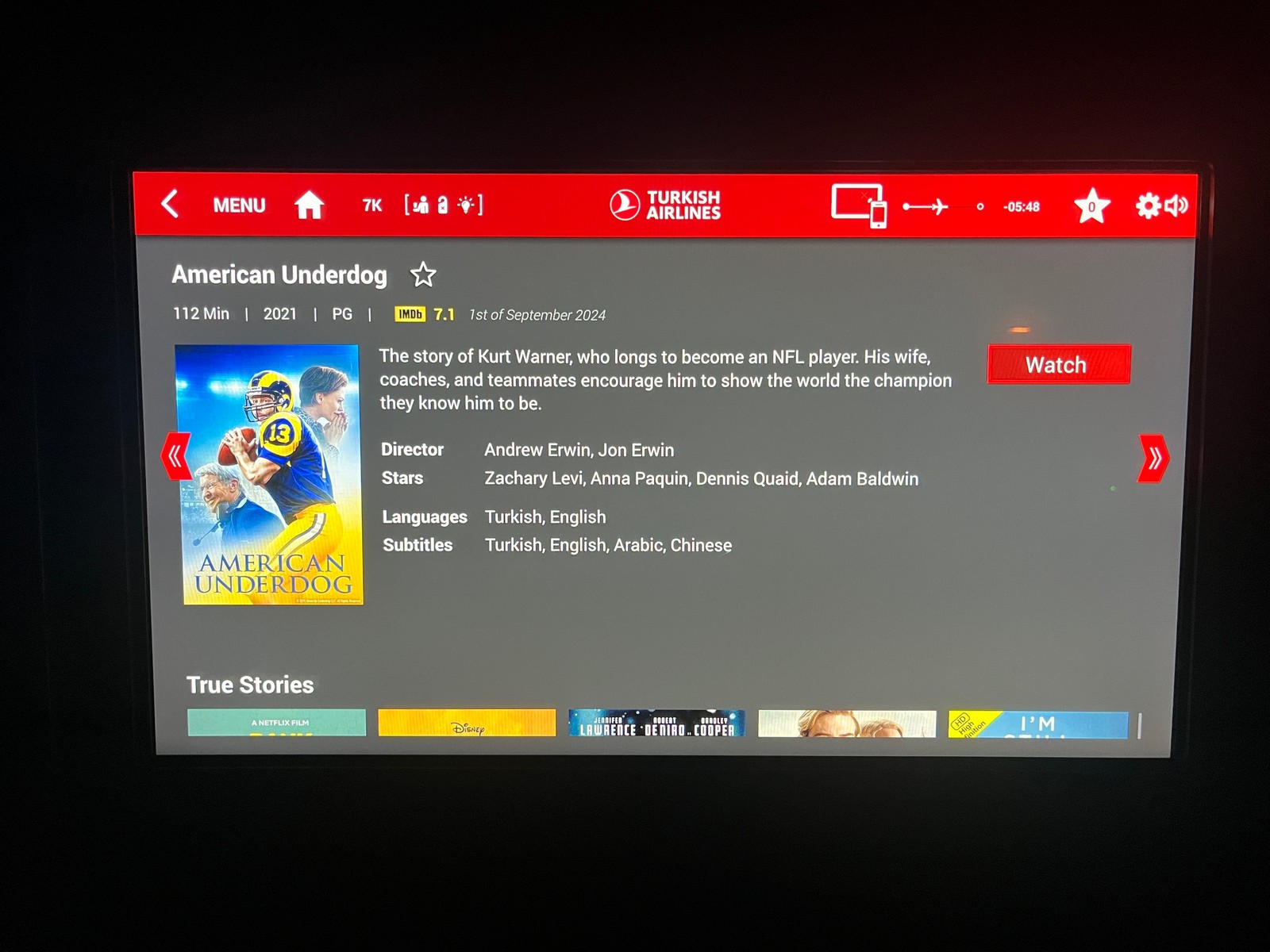 Das Turkish Airlines Entertainment-System gilt allgemein als eine der Stärken der Airline – eine Einschätzung, die ich basierend auf meinem Flug bestätigen kann. Jeder Sitz verfügt über einen hochauflösenden 18-Zoll-HD-Bildschirm, der sich komfortabel per Touch-Funktion oder über einen separaten Controller bedienen lässt. Die Menüführung ist intuitiv und die Bedienung funktioniert zuverlässig und ohne Ruckeln. Gepaart mit der großen Auswahl an Filmen, Serien und Dokumentationen – auf meinem Flug waren es 899 Filme und 2.055 TV-Produktionen – lässt es sich die Zeit gut vertreiben. Besonders praktisch finde ich den angezeigten IMDb-Score – so kann man sich auch offline ein Bild von der Qualität eines Films machen. Als etwas störend empfand ich die regelmäßige Einblendung von Werbefilmen zur Türkei als Reiseziel. Diese ließen sich zum Glück überspringen.